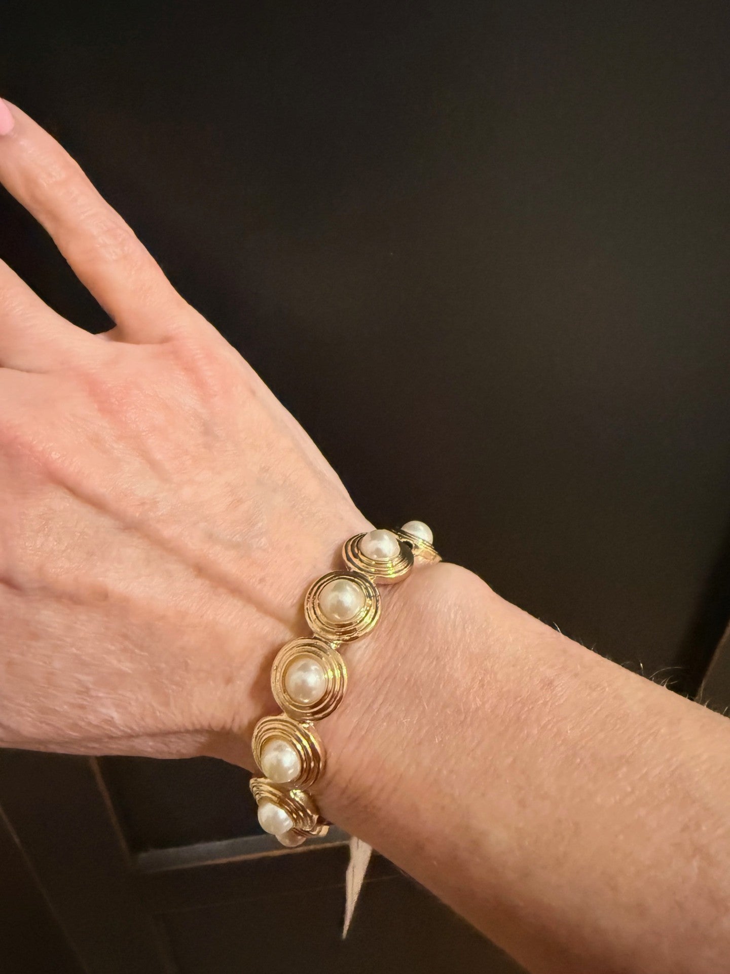 A little vintage glamour wrapped around your wrist. The Cooper Bangle features luminous ivory pearls set inside sculpted gold rings, giving each bead its own delicate “cage” of shine. Bold enough to stand alone, yet elegant enough to mix with other gold pieces, this hinge-style bracelet adds an instant touch of polished charm.