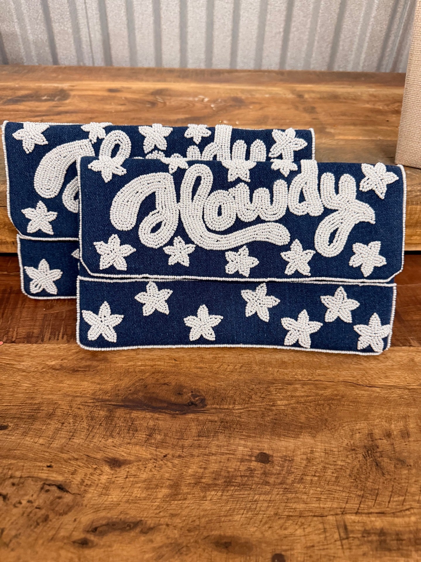 This Denim Howdy Beaded Bag adds a playful touch to any outfit with its fun mix of denim and sparkling beads. Perfect for carrying your essentials while making a stylish statement, this clutch combines casual charm with a bit of sparkle to brighten your day and your look.