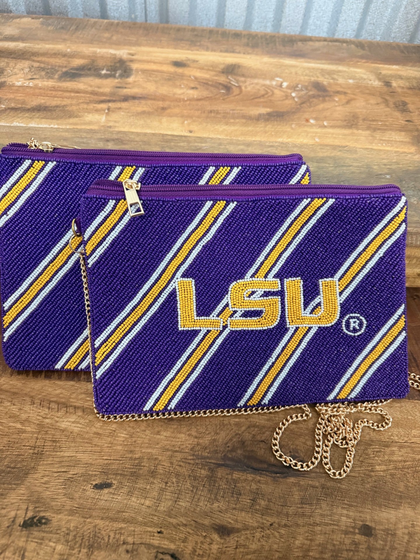 Show your LSU pride in style with the LSU Zipper Cross Body Bag! Perfect for gameday adventures, this fun purple and gold bag keeps your essentials close while you cheer on your team. Its hands-free design lets you dance, snack, and celebrate without missing a beat. Whether tailgating or watching from the stands, this vibrant bag is a playful must-have for any LSU fan.