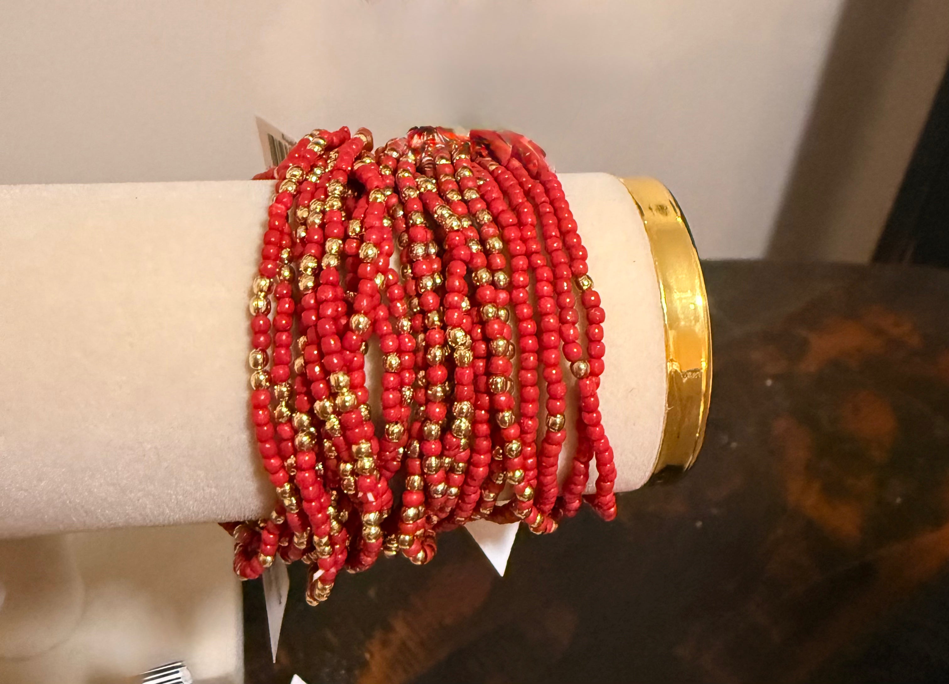 Add a vibrant touch to your accessory collection with these Splendid Iris Red and Gold Beaded Bracelets. Crafted from delicate 2mm red stretch seed beads and highlighted by shimmering gold accents, they ensure a comfortable fit that moves with you. Perfect for layering or wearing alone, these bracelets elevate any outfit with a splash of rich color and subtle elegance. Embrace a timeless look that stands out effortlessly.