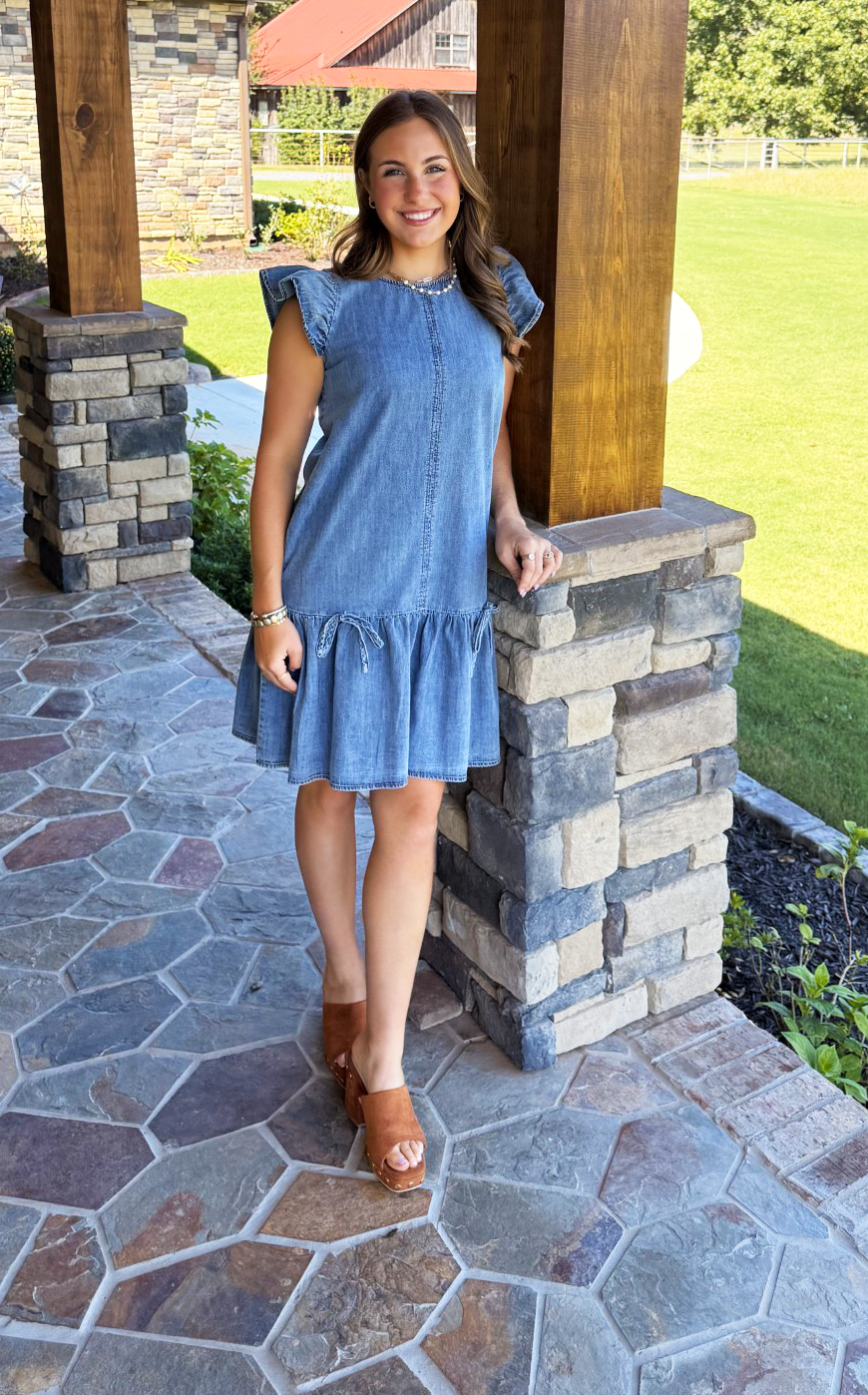 The Bluebonnet Ruffle Dress blends easygoing denim with a touch of feminine charm. Its flutter sleeves and relaxed fit make it effortlessly comfortable, while the playful ruffle hem and tie details add a flirty twist. Whether you're headed to a casual day out or an outdoor brunch, this dress brings a breezy Southern vibe to your look. Pair it with sneakers or sandals for a fun, chic outfit that’s ready for wherever the day takes you.