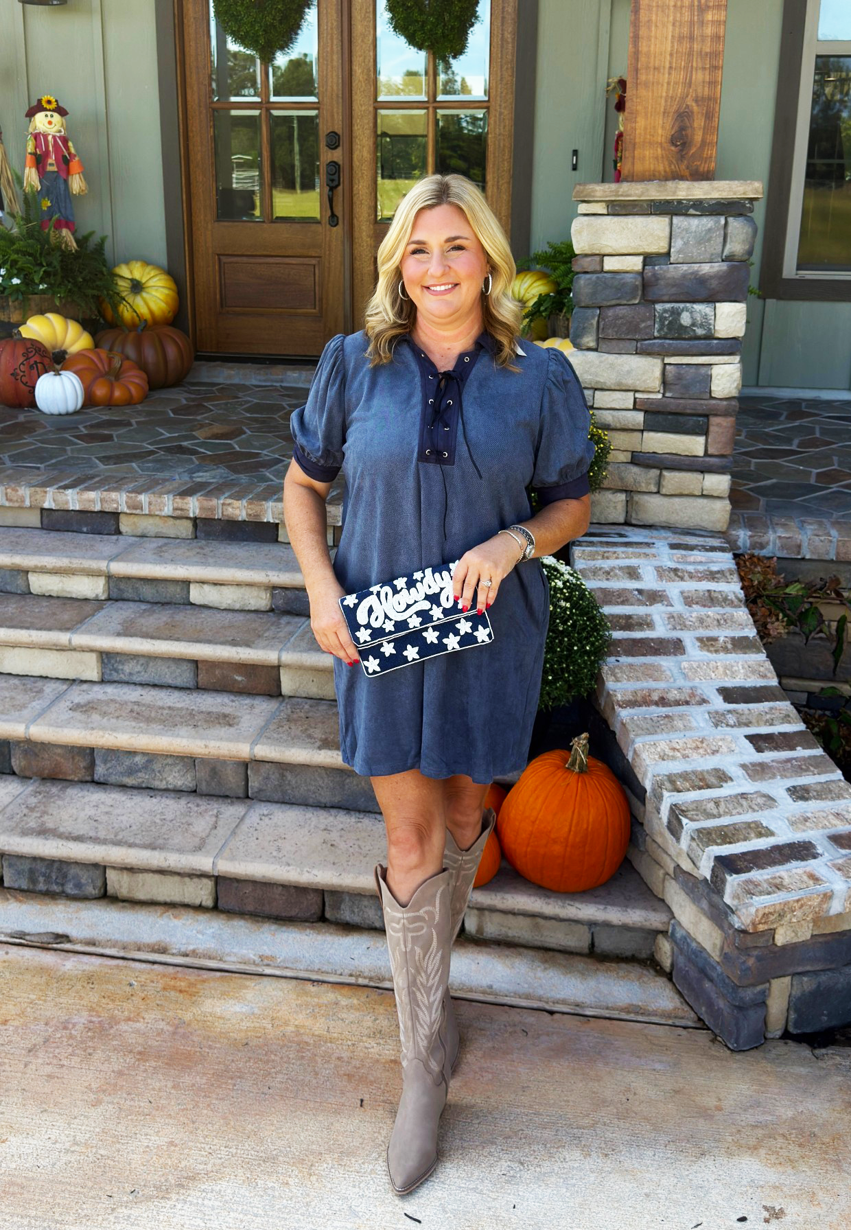 The Busy in Blue Dress brings playful charm to your wardrobe with its soft brushed cotton fabric and short sleeves. Designed above the knee for easy movement, it features a collared neckline accented by a unique leather lace-up tie that adds a touch of fun to your everyday look. Perfect for busy days when style and comfort go hand in hand.