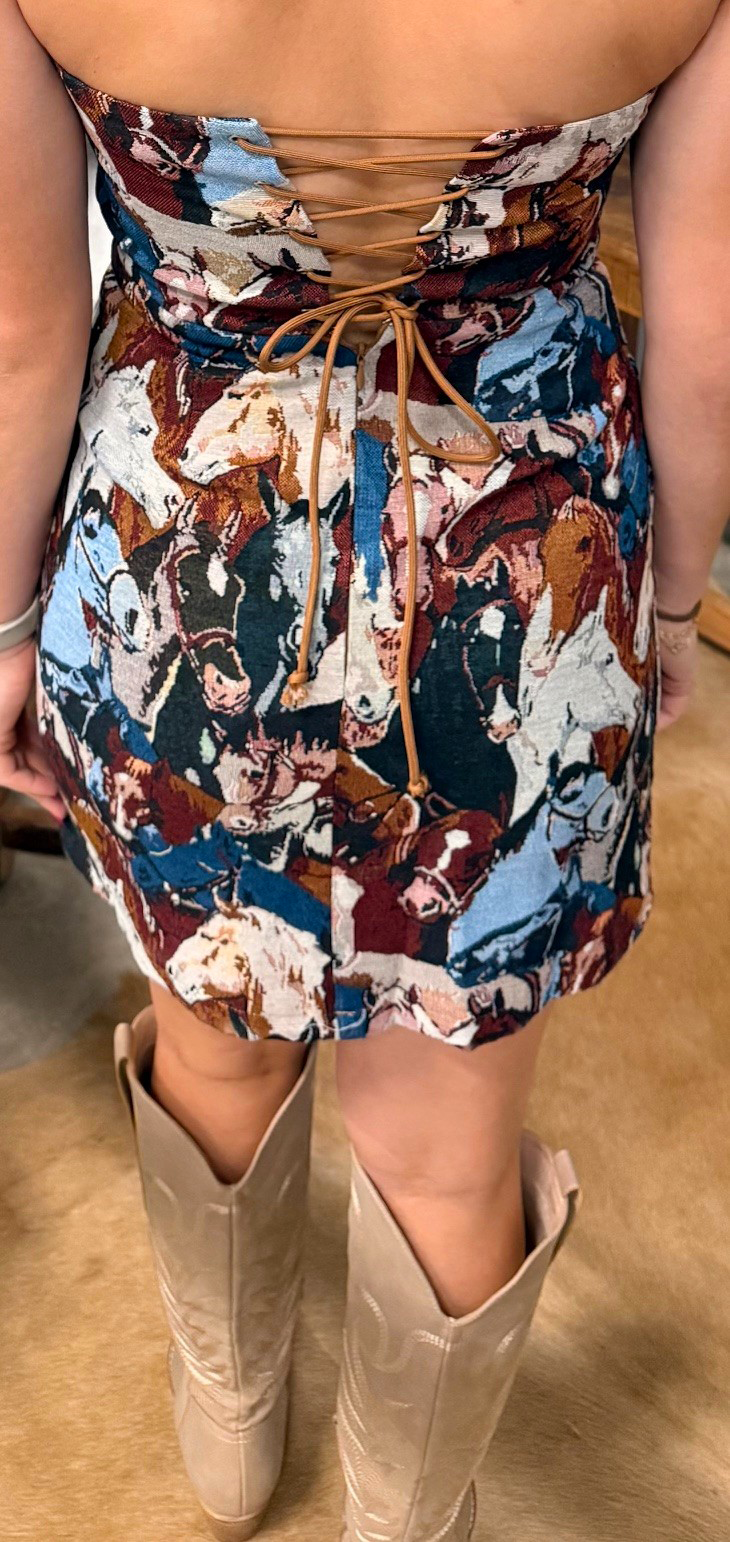 Turn heads at your next rodeo, concert, or girls’ night out with this Horse Head Tapestry Corset Dress, designed for Western-loving fashionistas who want a bold, unique look. Crafted from a premium woven tapestry fabric, this strapless Western mini dress features an allover horse-print pattern in rich, earthy tones. The lace-up corset back creates a flattering, snatched silhouette, making this the perfect cowgirl dress for festivals, stock shows, NFR trips, and boutique-style country events.