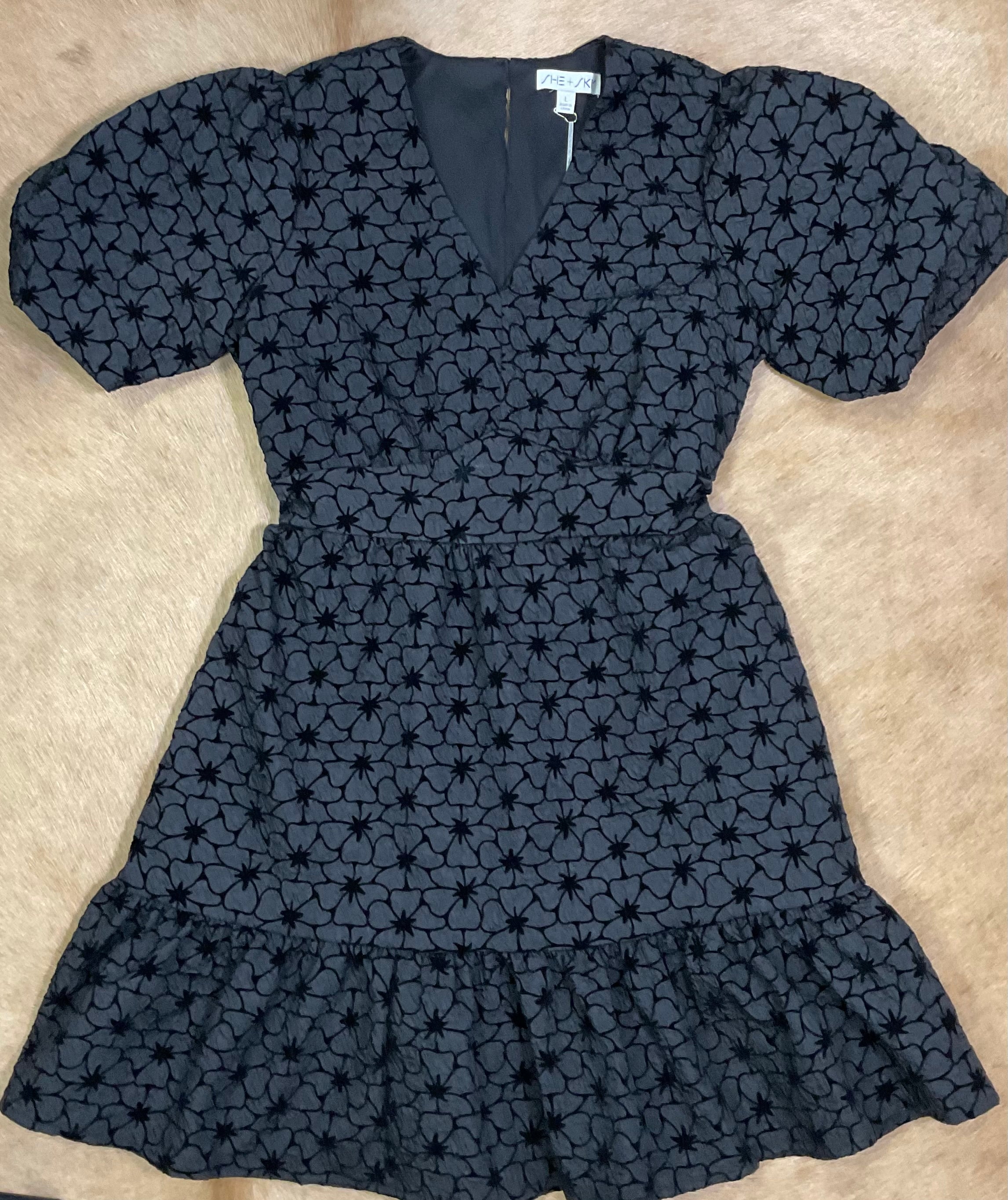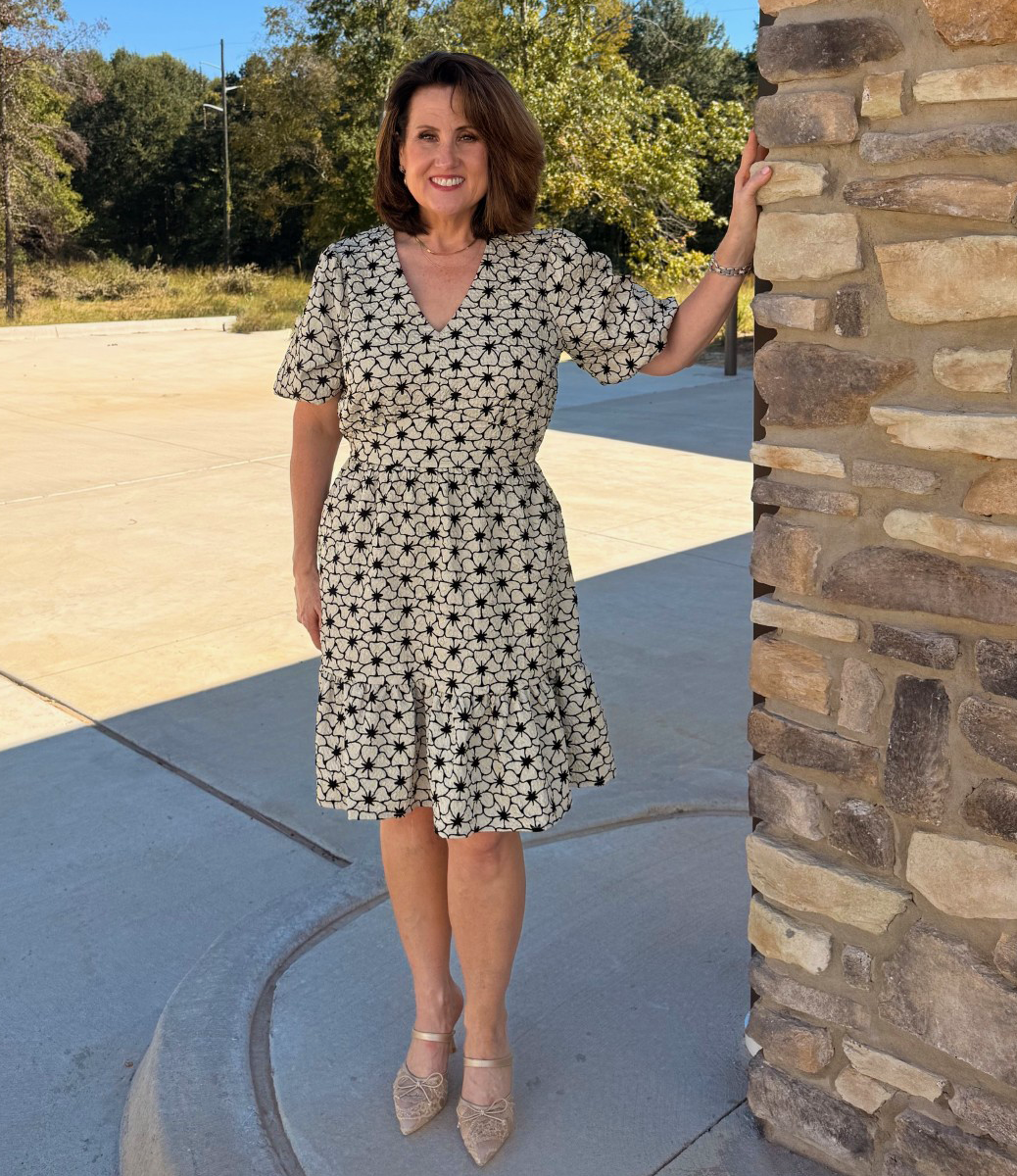 Make an entrance in this stunning black floral lace dress. Featuring puff sleeves, a flattering V-neckline, and a cinched waist, it flows into a tiered ruffle hem for the perfect touch of feminine charm. The intricate floral overlay lends it a romantic, elevated look that suits everything from dinner parties to weddings. Pair it with heels for a night out or boots for a chic daytime vibe.
