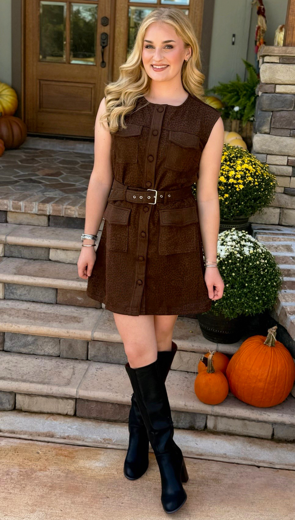 Embrace your fierce side with the "Ready to Roar" sheath dress. Made from soft micro suede in a rich chocolate brown cheetah pattern, it combines style and functionality with utility-inspired pockets and a button-front detail. The belted waist adds a playful touch while highlighting your shape, making this dress perfect for turning everyday into a wild adventure.