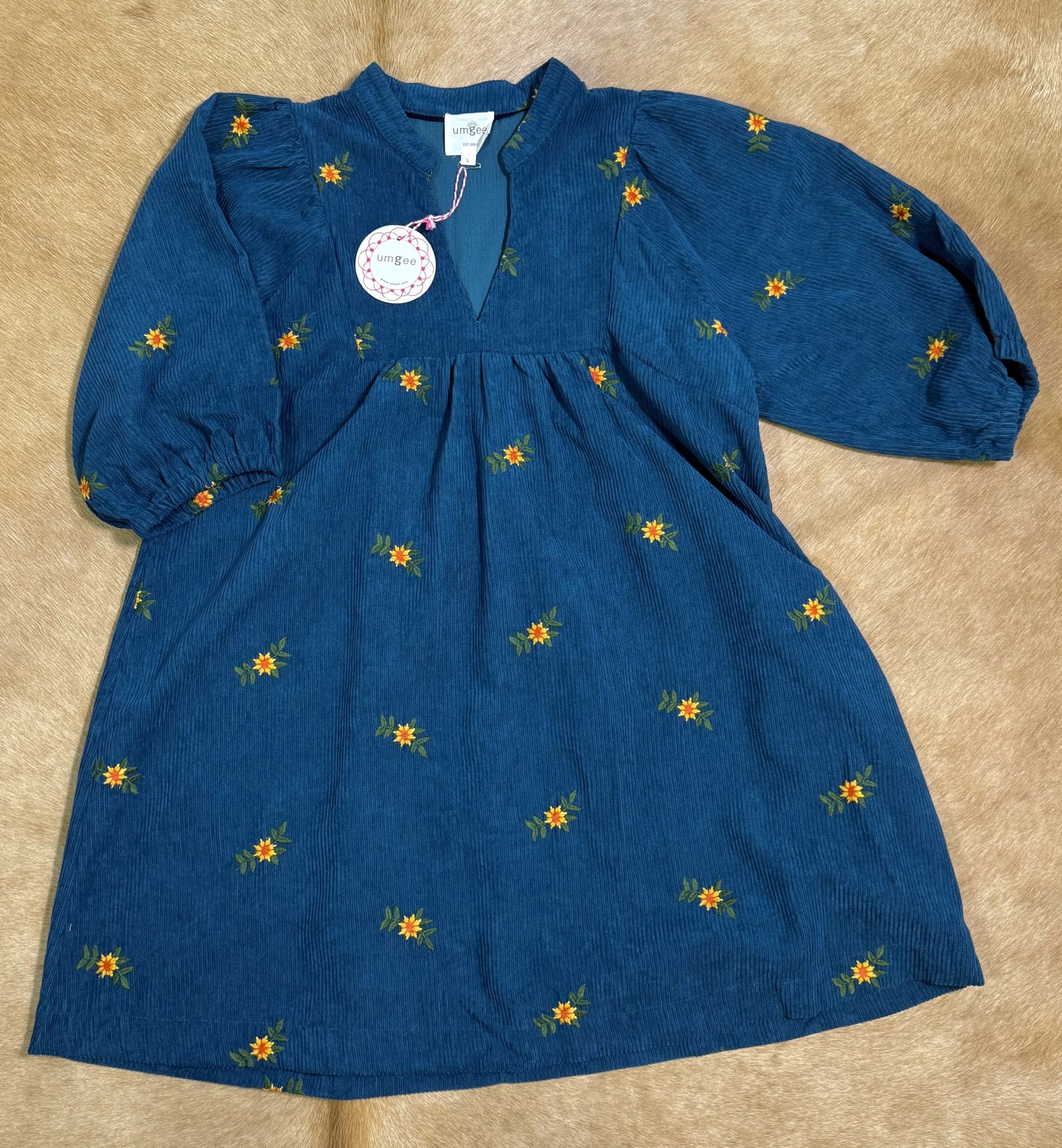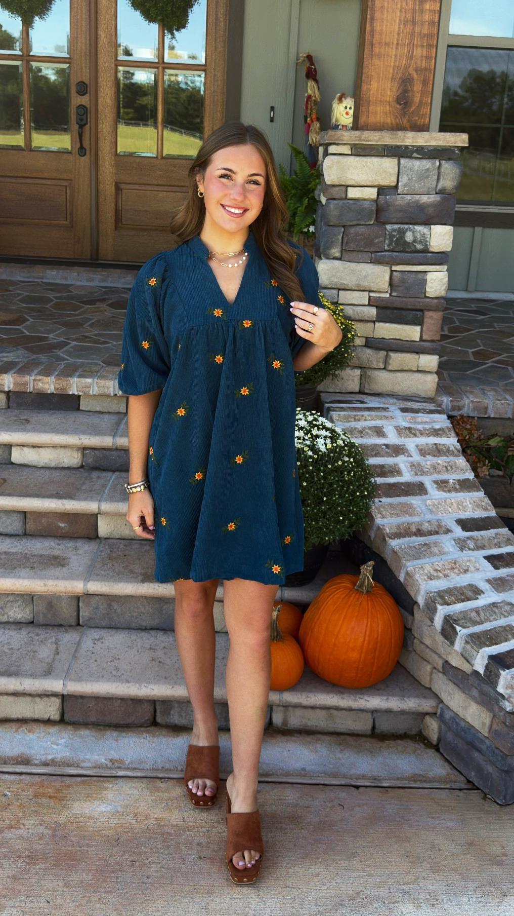 Wear a ray of sunshine with our Sunshine & Corduroy Dress. Made from soft teal-blue corduroy, this delightful dress showcases cheerful golden-yellow embroidered florals that brighten your day. Its relaxed A-line shape, ¾ puff sleeves with elastic cuffs, and a split neckline perfectly blend playful charm with polished style. Ideal for farmer’s market adventures, brunch dates, or cozy fall get-togethers, it brings effortless joy wherever you go. Dress it up with boots for a rustic flair or keep it casual with sneakers. A sunny wardrobe essential that lifts your spirits every time you wear it.