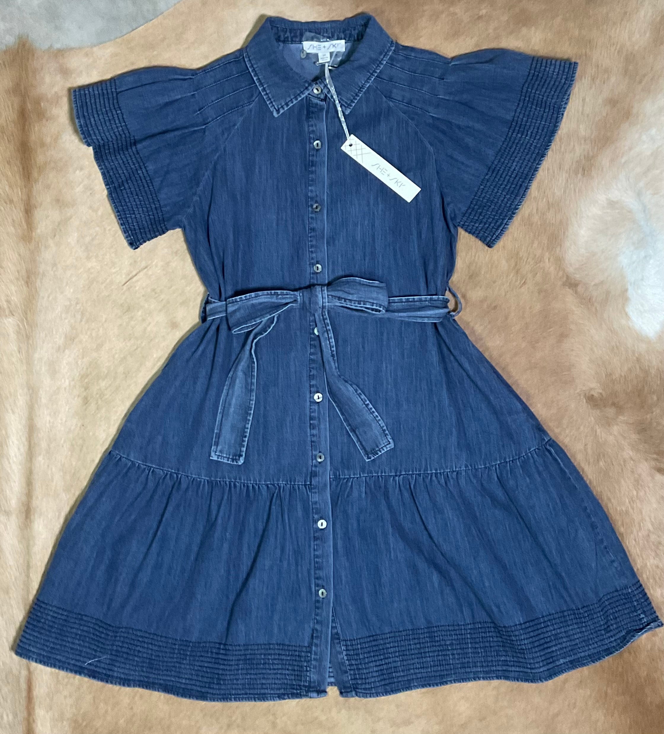 Our Flirt Denim Dress mixes timeless style with a fresh twist, becoming the go-to piece your closet has been craving. Featuring a button-down front, flouncy tiered skirt, and flutter sleeves accented with stitched details, this dress keeps things playful and feminine. The detachable waist tie hugs your shape perfectly, offering comfort and style in one. Whether you're out for brunch or dressing down for casual Friday, pair it with sneakers, sandals, or boots for effortless year-round charm. Details: Medium wash denim, button-down collar, stitched hem, flutter sleeves with smocked touches, removable waist belt, relaxed fit that flatters.
