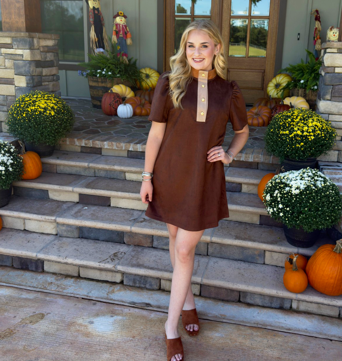 Elevate your wardrobe with the THML Three Toned Brown Suede Dress, featuring a rich dark brown body accented by a tan mandarin collar and a cream button placket. This short-sleeve dress combines classic suede texture with a modern three-tone palette, offering a sophisticated yet versatile look perfect for any occasion. Comfortable and stylish, it’s designed to make a confident statement wherever you go.