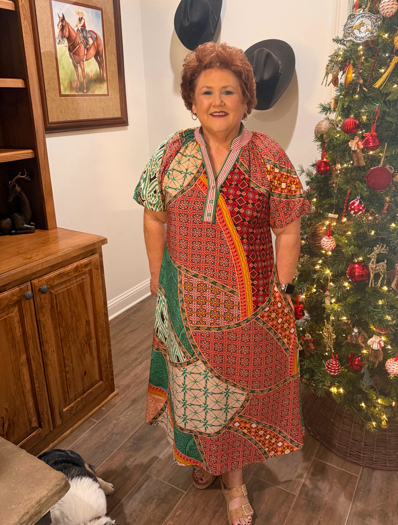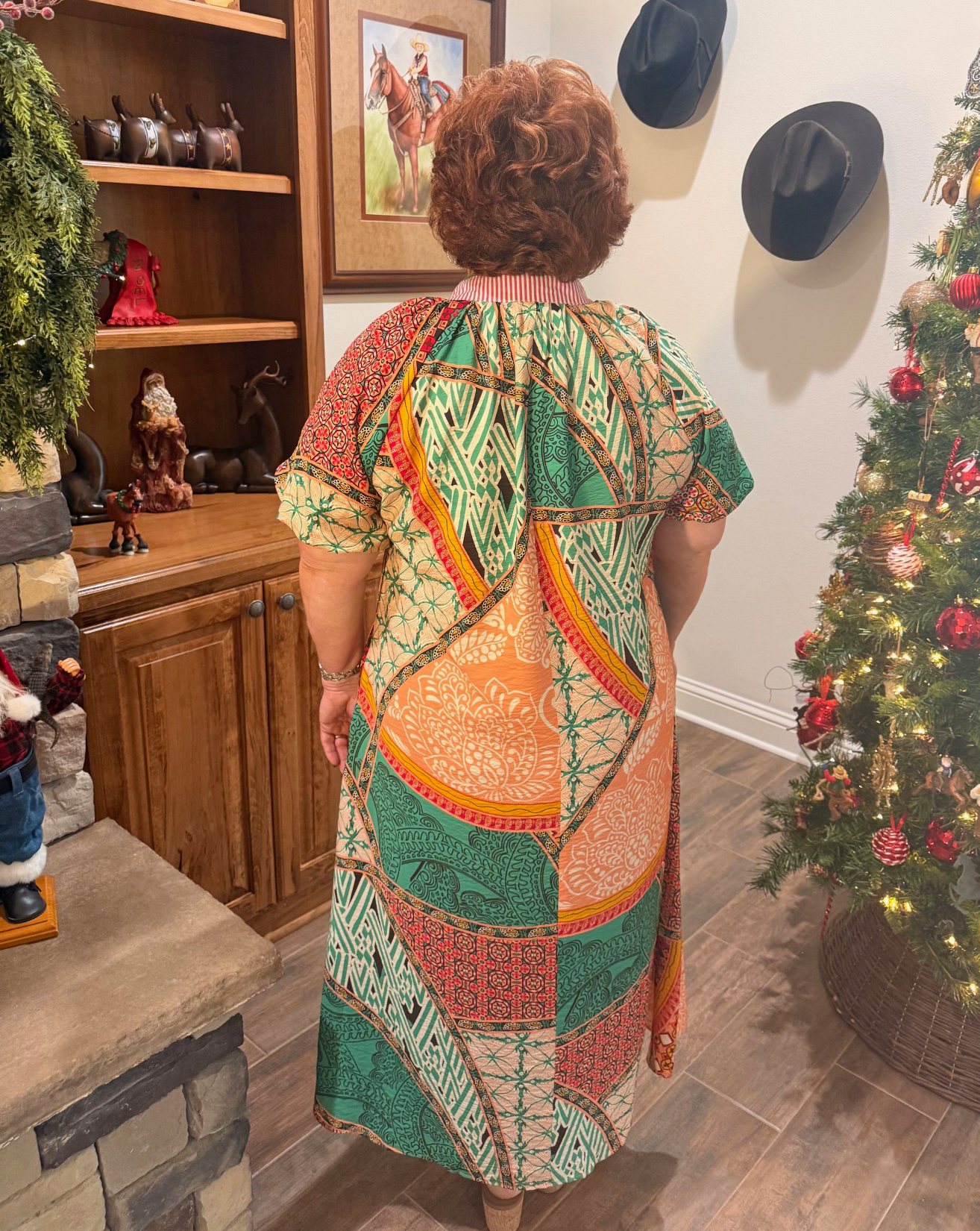 Vibrant, bold, and full of personality—this patchwork maxi dress is a true statement-maker. Featuring a stunning mix of rich patterns in sunset-inspired tones of coral, berry, gold, and green, every panel brings its own unique flair. The relaxed fit flows beautifully, while the button-front neckline and striped trim add a playful contrast. A removable green waist tie gives you the option to cinch the silhouette for a more defined shape or wear it loose for easy, breezy comfort.