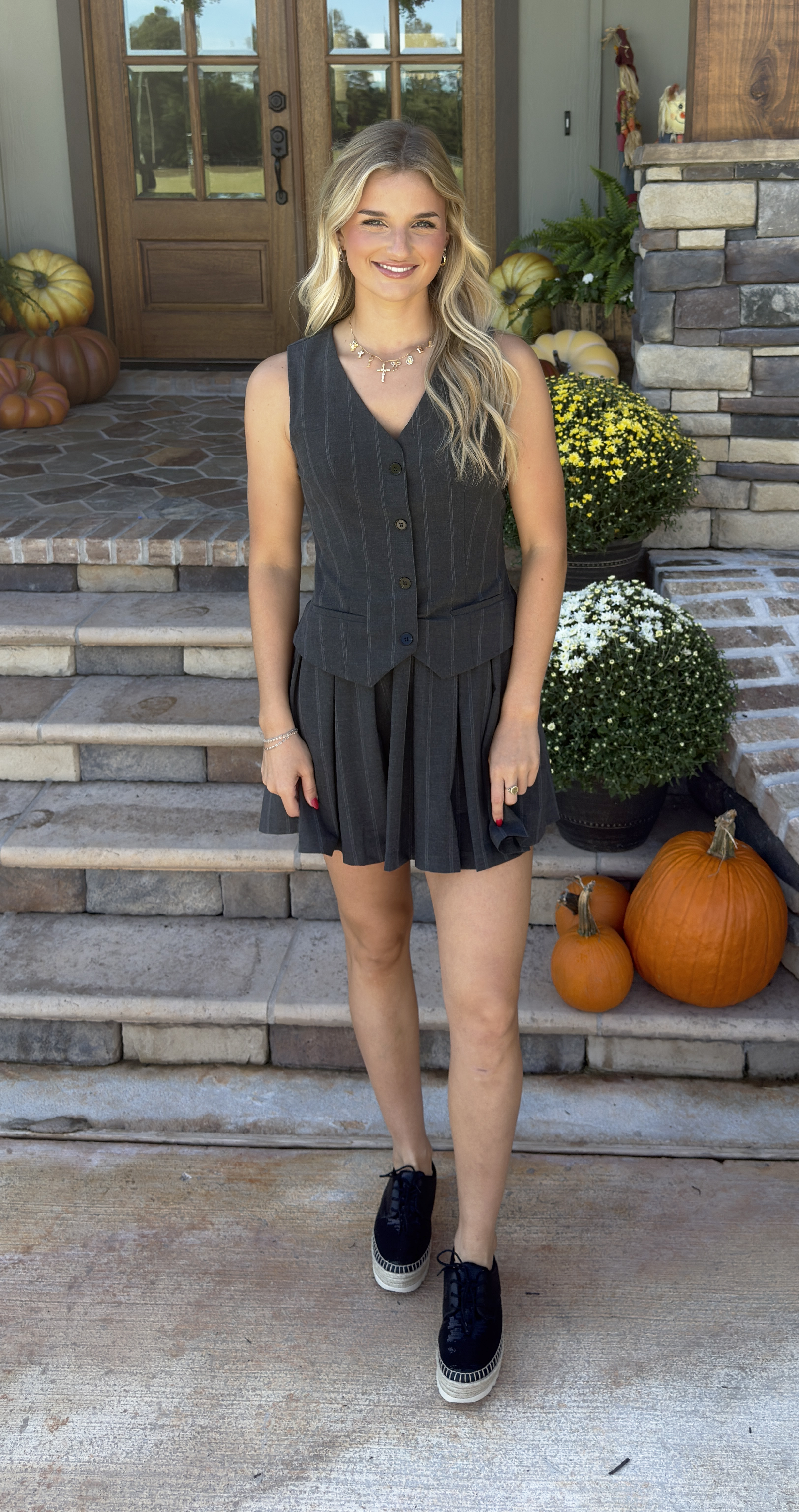 Power dressing but make it playful. The Boardroom Chic Dress features sharp pinstripes, a tailored vest-style bodice, and a flirty pleated skirt that brings movement and edge. Sleeveless with a button-front detail, it’s the perfect blend of structured and feminine—ideal for when you want to command the room without compromising your style. Pair with heels and a blazer for polished boss mode or throw on sneakers for a cool off-duty vibe.