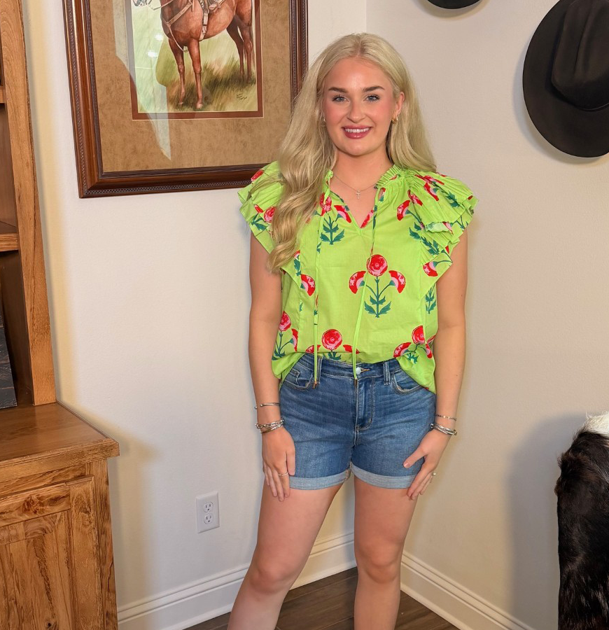 Bright, playful, and bursting with personality, this apple green top is made to turn heads. The cheerful green background is dotted with bold red floral motifs, creating a fun, artsy print that feels both modern and whimsical. The statement flutter sleeves add drama in the best way, giving this top a flirty, feminine finish.