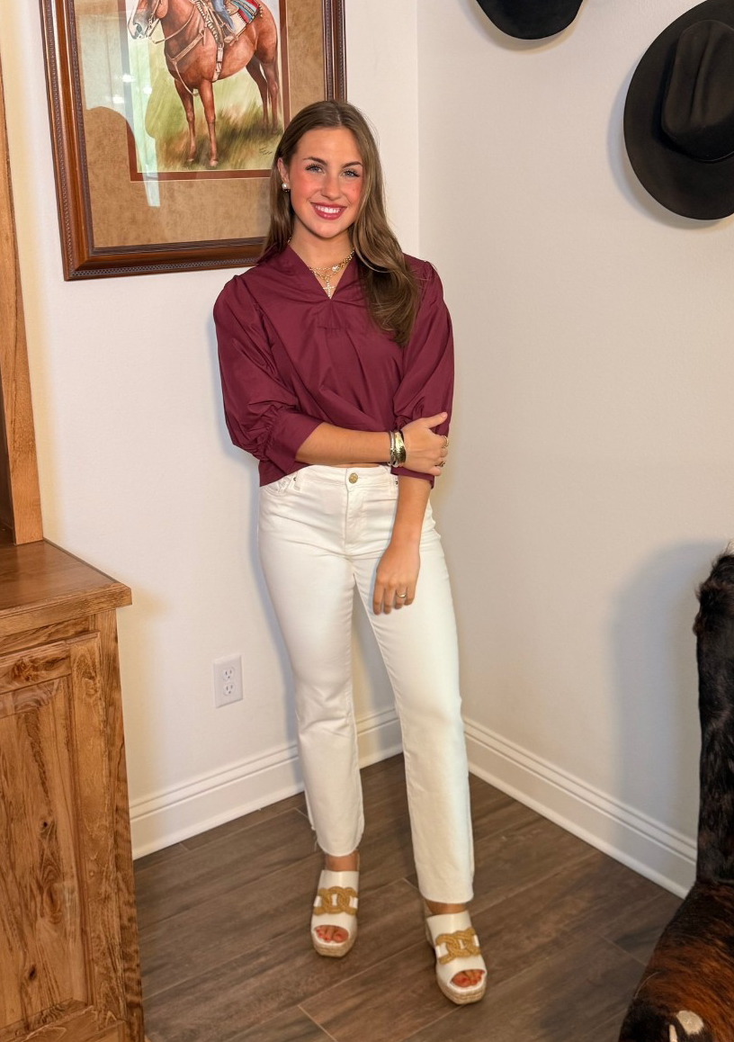 Effortlessly chic with just the right touch of drama — our wine blouse by Entro is a fall favorite you’ll reach for again and again. Featuring gathered sleeves, a flattering split neckline with a soft collar, and a relaxed yet structured silhouette, this top blends sophistication and comfort beautifully.