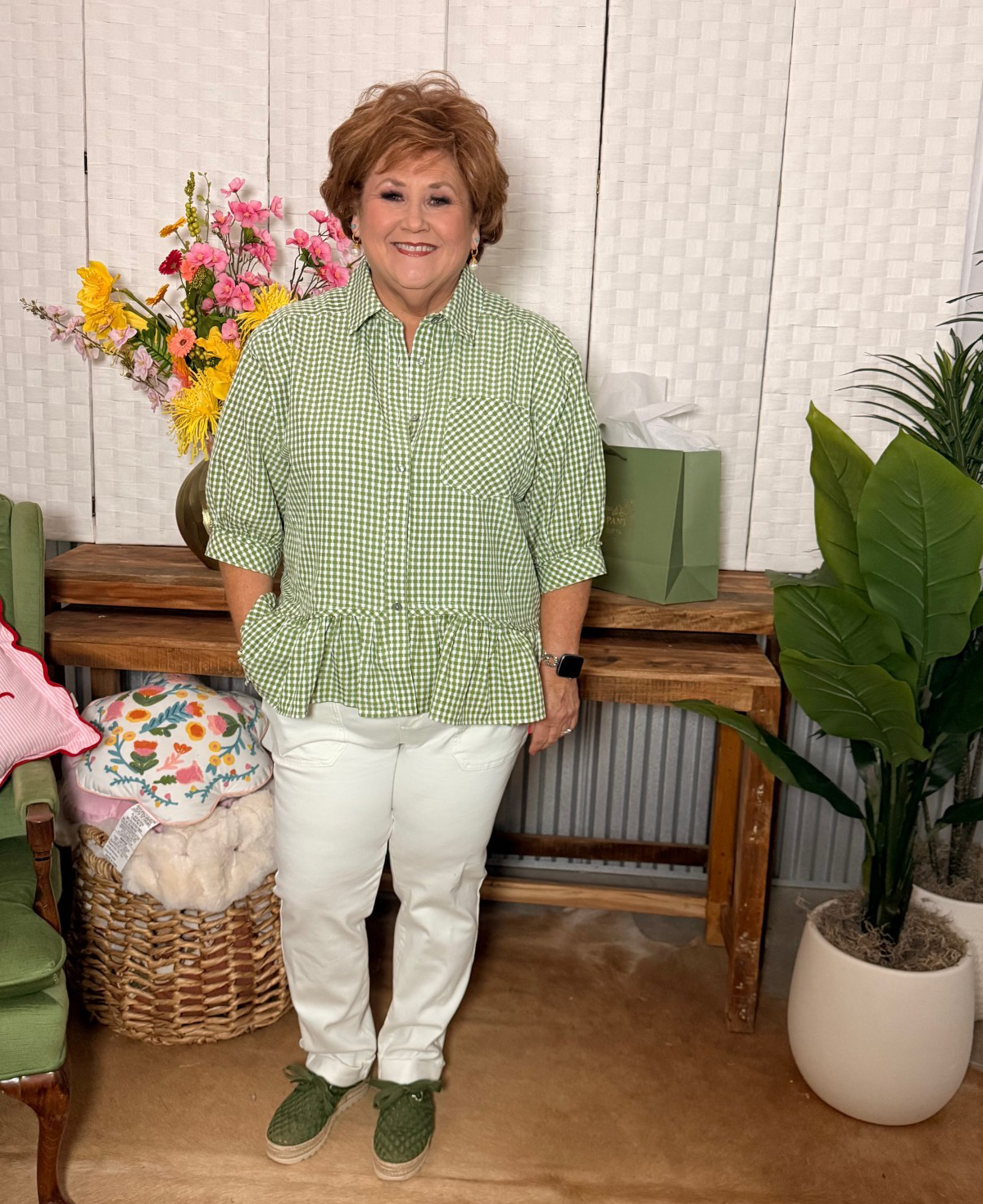 Classic gingham gets a fun, feminine update in this easy button-front top. The soft green hue feels fresh and on trend, while the flouncy ruffle hem adds movement and shape. It’s structured up top and flowy at the waist, making it both flattering and comfortable.
