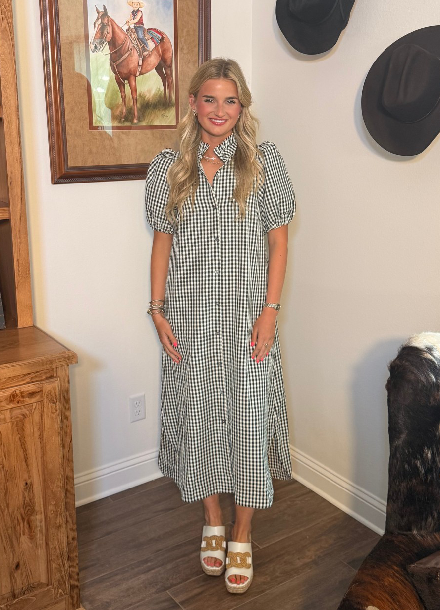Sweet meets tailored in this timeless gingham button-front dress. The structured collar and puff sleeves add just enough drama, while the flowy maxi length keeps it easy and wearable. It’s polished without feeling fussy, which makes it a closet MVP.