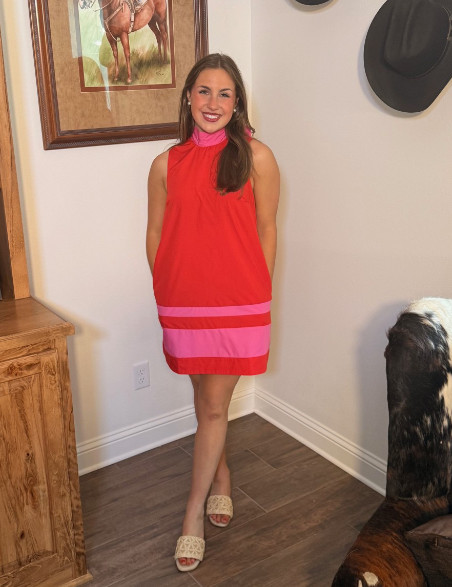 Bold color meets effortless charm in this eye-catching Entro dress. Designed in a vibrant red with playful pink contrast bands, this sleeveless swing silhouette is all about easy movement and standout style. The relaxed A-line shape floats away from the body, making it flattering, comfortable, and perfect for warm days when you want color to do the talking. 💗❤️