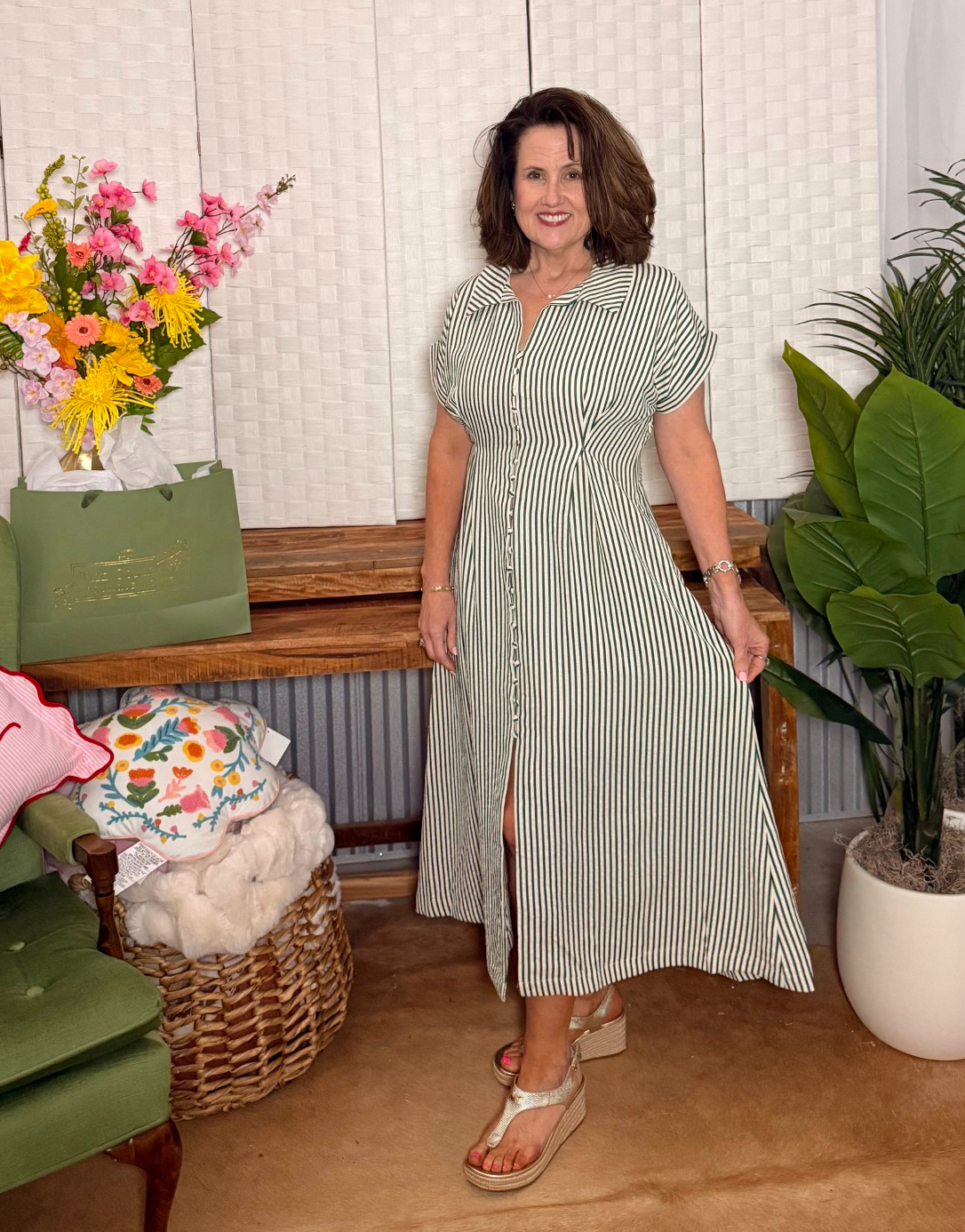 Step into effortless charm with this beautiful dress from Entro. Featuring timeless vertical stripes, a flattering button-down front, and a breezy midi length, this piece is made for strolling through summer days or layering with a denim jacket on cooler nights. Its collared neckline and tailored fit give it just the right touch of polish, while the easy silhouette keeps it relaxed and wearable. Pair with sandals for daytime adventures or wedges for an evening out—this dress does it all with classic Southern ease.