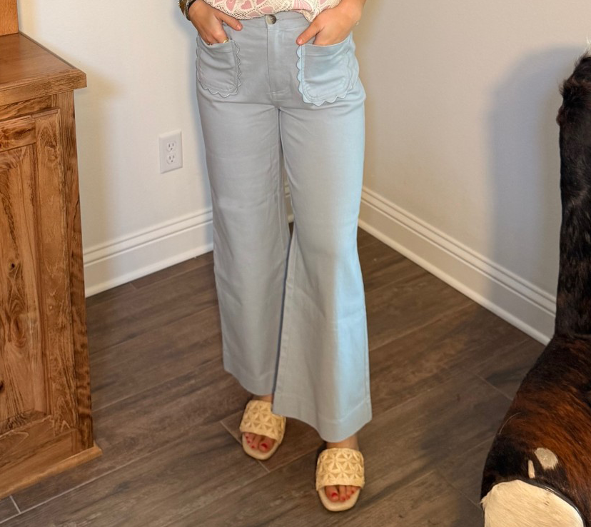 Classic structure meets charming detail in the Sweet Detail Pants. Designed in a soft dusty blue hue, these high-waisted pants feature the cutest scalloped front pockets that add a feminine, eye-catching twist to a timeless silhouette.