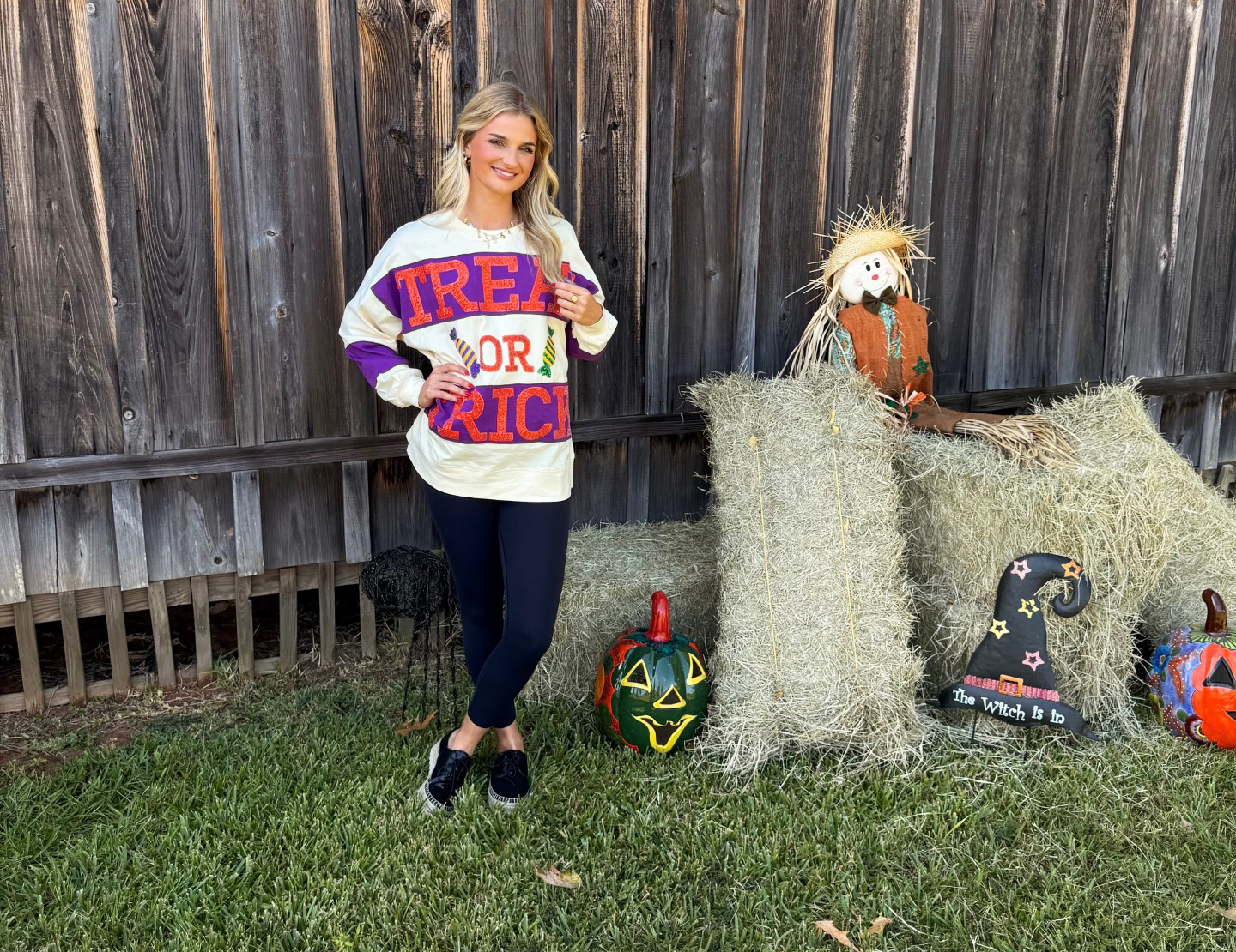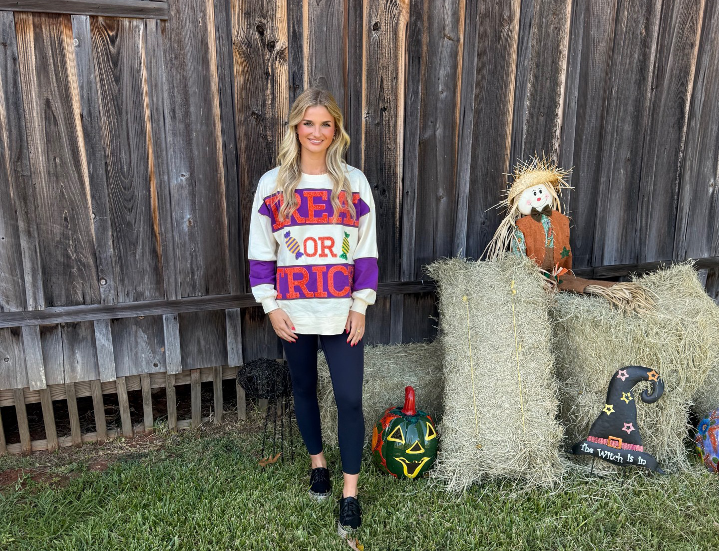 Celebrate the season with the Fantastic Fawn Color Block Treat or Trick sweatshirt. Its cream oversized fit ensures cozy comfort, while vibrant color blocks add a stylish edge. Sparkling sequins highlight the playful "trick or treat" theme, making it perfect for festive fun or casual wear. Embrace both comfort and charm this Halloween with this eye-catching sweatshirt.