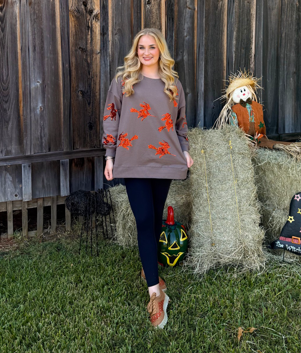 Get cozy with the Fantastic Fawn Sequin Witch Sweatshirt, a perfect blend of comfy and casual for Halloween fun. This oversized grey sweatshirt features sparkling sequin witch artwork, adding a playful touch to your spooky season wardrobe. Stay warm and stylish while embracing the festive spirit with this fun, easy-to-wear favorite.