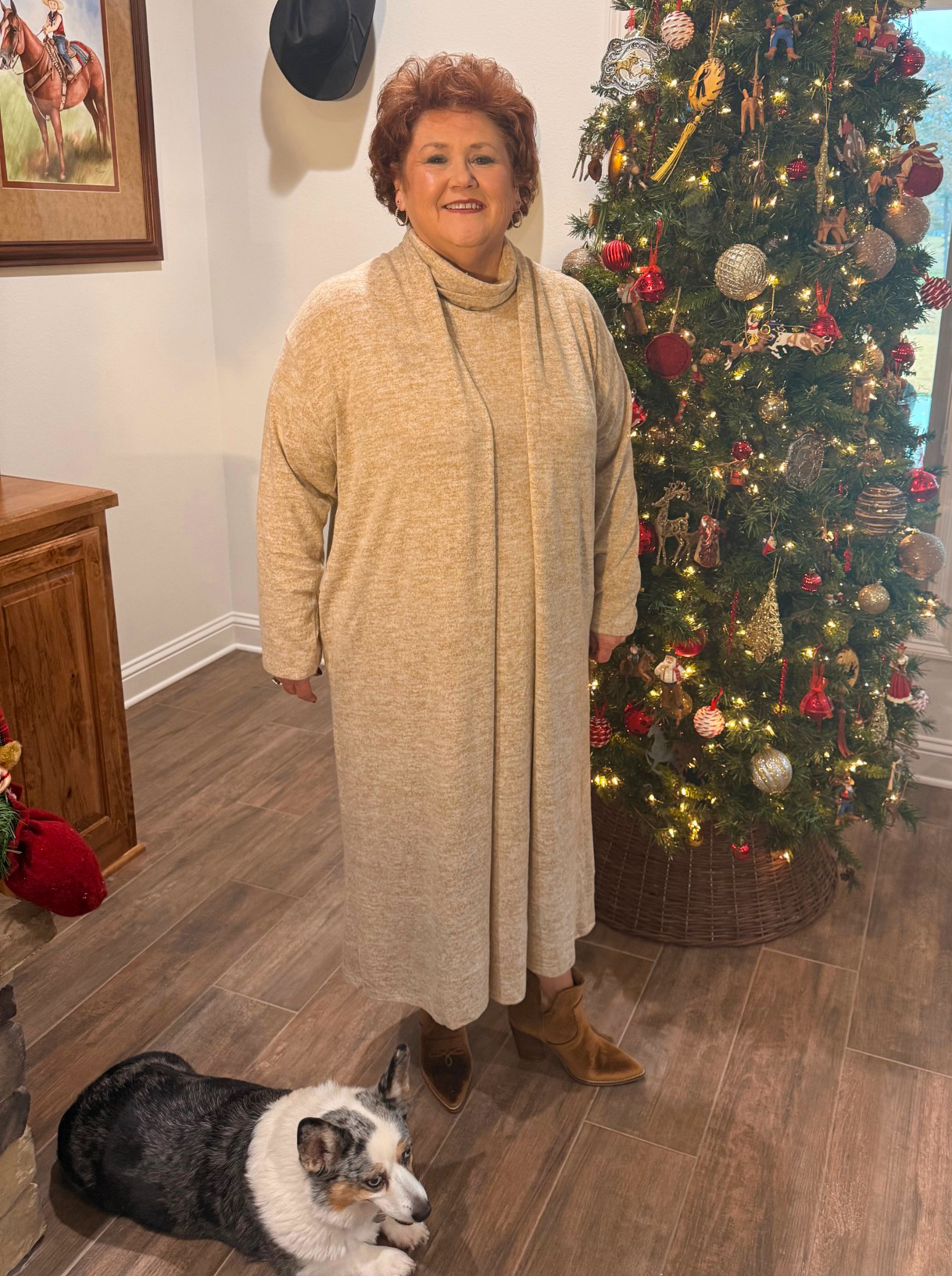 Feel wrapped in luxury with this unbelievably super-soft sleeveless sweater dress paired with its matching long duster. The fabric is buttery, cozy, and drapes beautifully — giving you that elevated, effortless look while keeping you wrapped in comfort. The sleeveless dress is perfect for layering, and the long duster adds movement, warmth, and a touch of understated elegance.