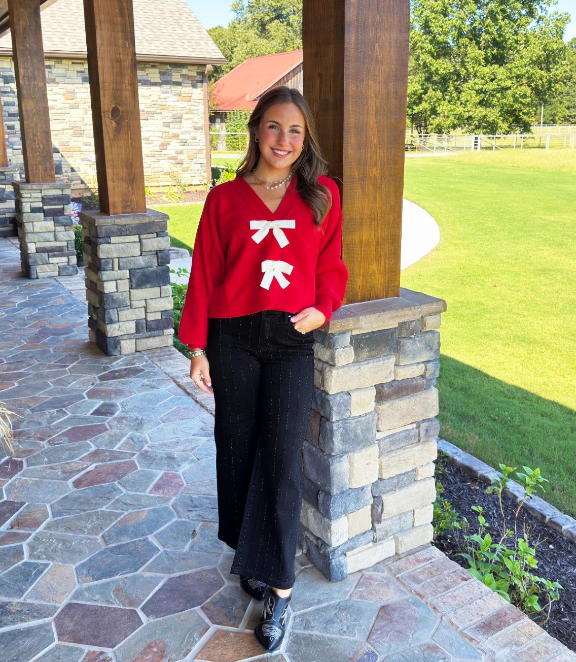 Cozy up in this playful red oversized cardigan, featuring charming white bow closures that add a touch of whimsy to your look. Perfect for layering on chilly days, its roomy fit invites comfort while making a bold style statement. Brighten your wardrobe with this fun and cozy favorite!