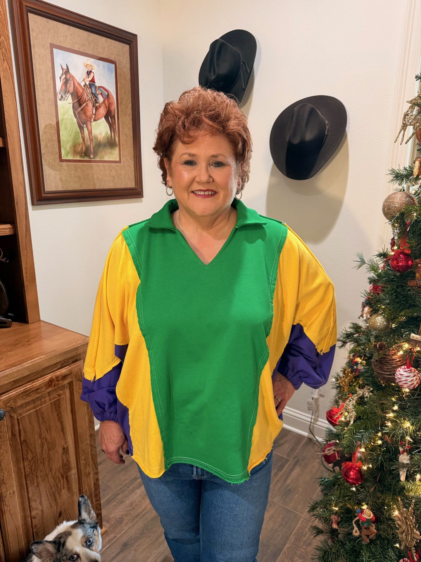 Whether you’re catching beads at the parade or just bringing a little carnival cheer to your everyday wardrobe, this top is pure Louisiana fun with a boutique twist.