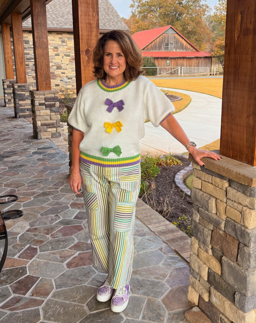 Sweet, festive, and so fun! This Mardi Gras sweater brings the charm with three soft knit bows in classic MG colors — purple, yellow, and green — right down the front. The neckline, sleeves, and hem are trimmed in matching Mardi Gras stripes, giving you the perfect pop of parade-ready color. Cozy, cute, and just the right amount of extra — exactly what Mardi Gras calls for!