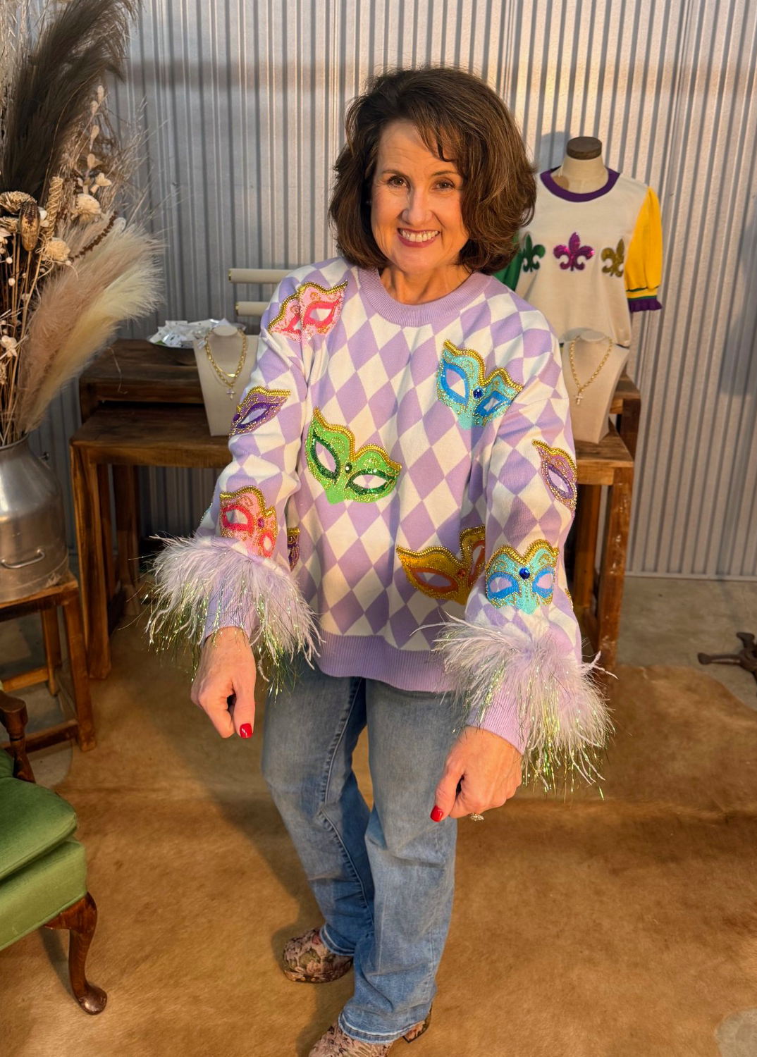 Step into Mardi Gras magic with this playful, statement-making sweater! Featuring a soft lavender argyle print topped with colorful sequin masquerade masks, this piece brings all the festive flair without sacrificing comfort. The real showstoppers? The whimsical feathered cuffs that shimmer and move with you — perfect for parades, parties, or simply showing your Louisiana spirit in style.
