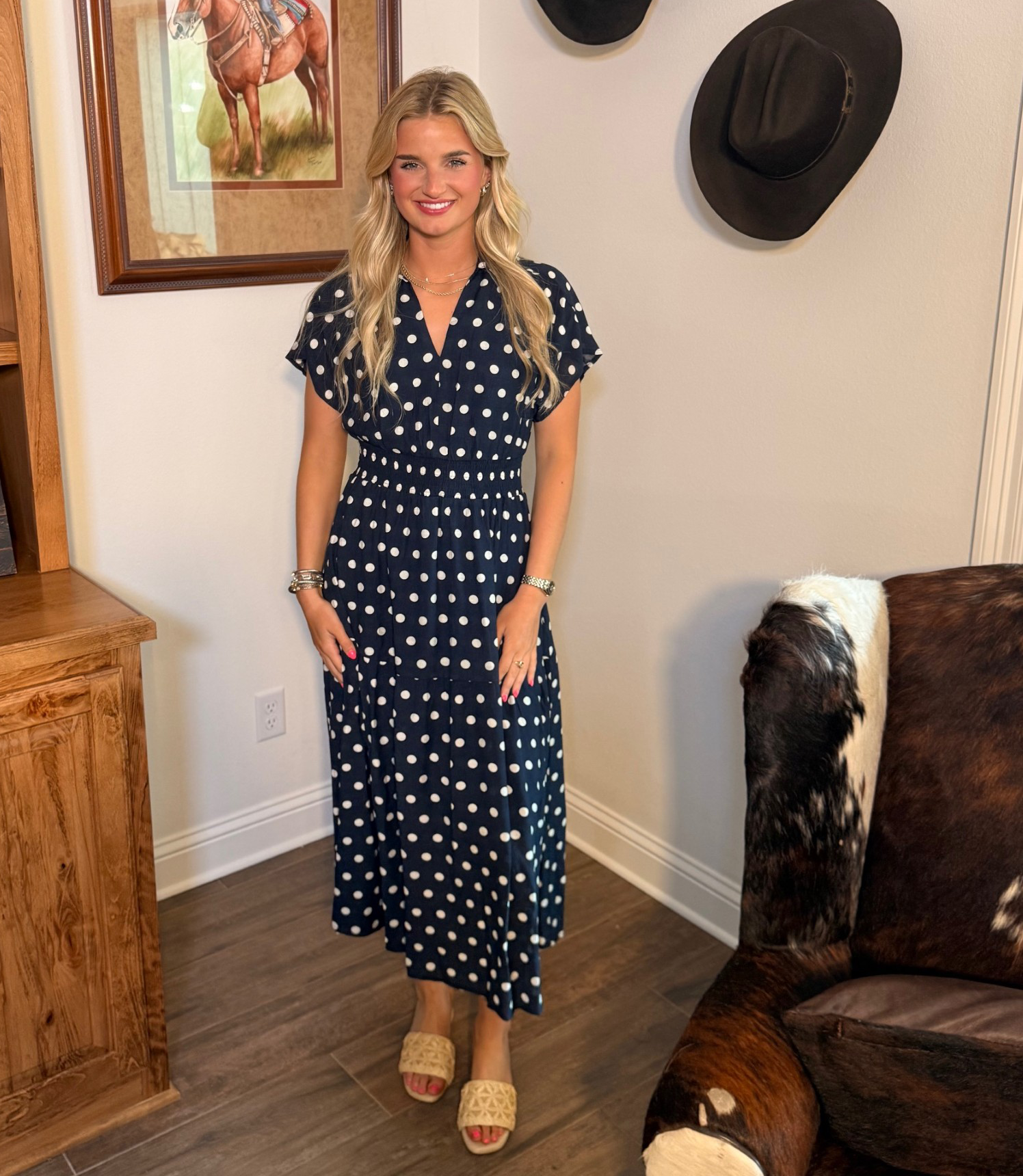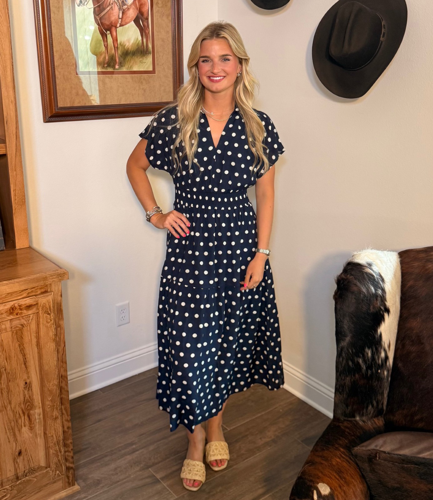 Pair the navy with nude or red accessories for a bold pop. Style the cream with brown wedges and gold jewelry for that polished Southern glow. Add a denim jacket for cool evenings in Haughton.