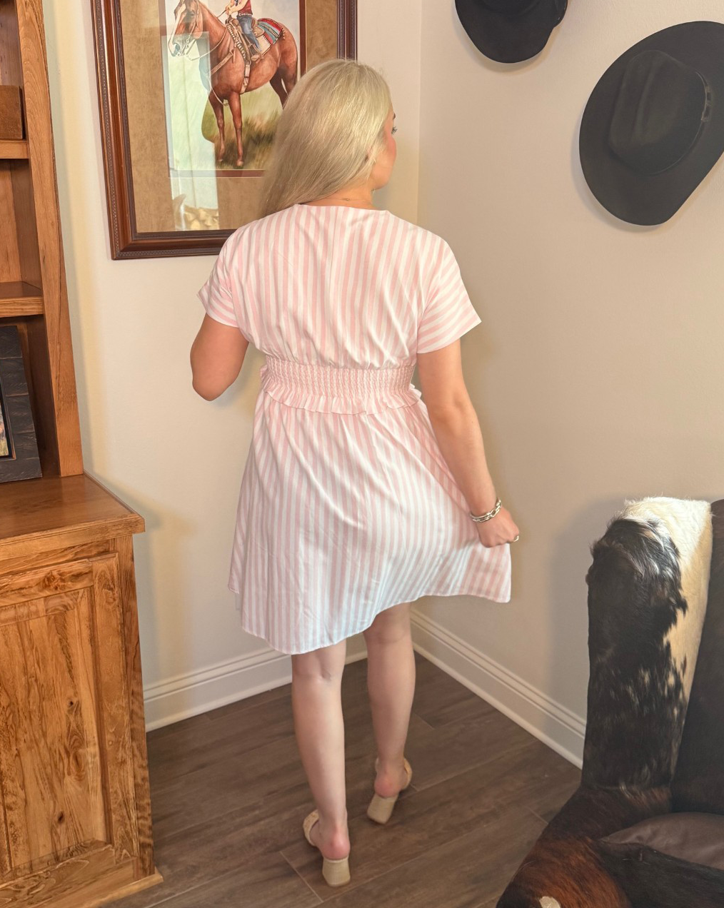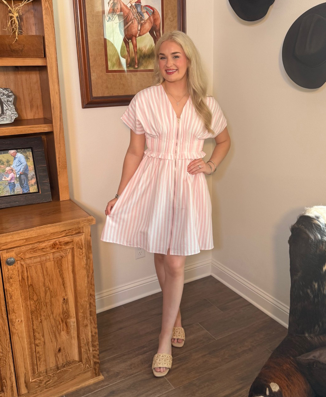 Light, breezy, and made for sunshine days, this pink and white striped dress is the definition of easy Southern charm. The soft vertical stripes create a flattering, lengthened look, while the fluttery sleeves and ruffle waist add just the right touch of playful movement. That front zip detail gives it a modern, sporty twist that keeps it feeling fresh instead of fussy.