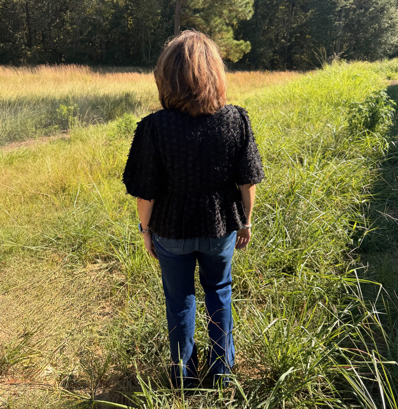 Elevate your look with this THML Black textured top, a statement piece that blends elegance and edge. Crafted with richly textured black fabric with fringe detailing, this top features dramatic puff sleeves and a flattering waistline for a feminine silhouette. The front ties with oversized grosgrain bows, adding a touch of modern romance and sophistication.