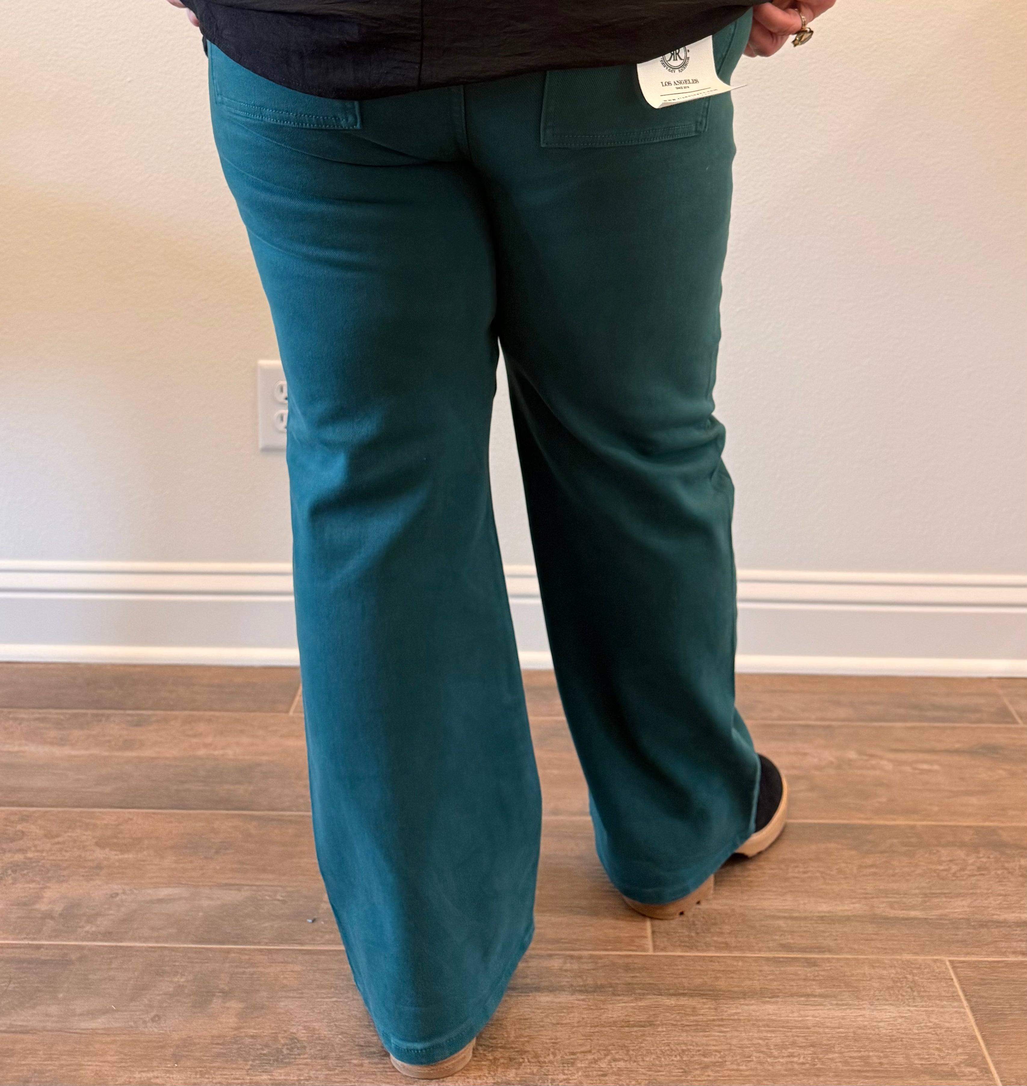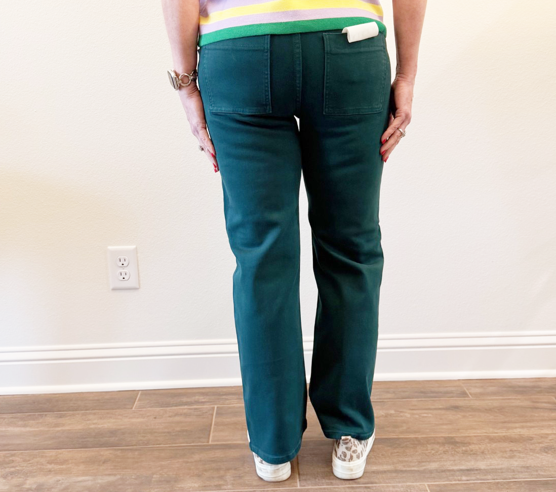 Make a statement without saying a word. These hunter-green utility pants deliver the perfect blend of bold color, soft stretch, and everyday practicality. Designed with oversized front patch pockets and a flattering straight-leg fit, they’re the kind of pants that instantly elevate even the simplest outfit. Comfortable, stylish, and totally unique — a must-have for fall and beyond.