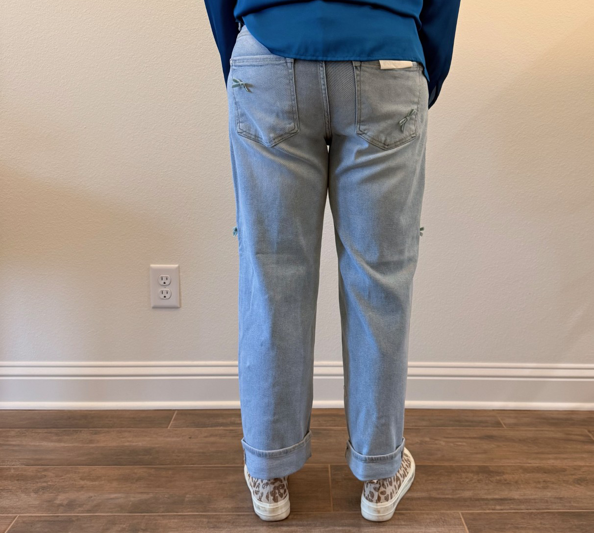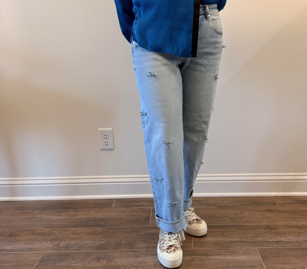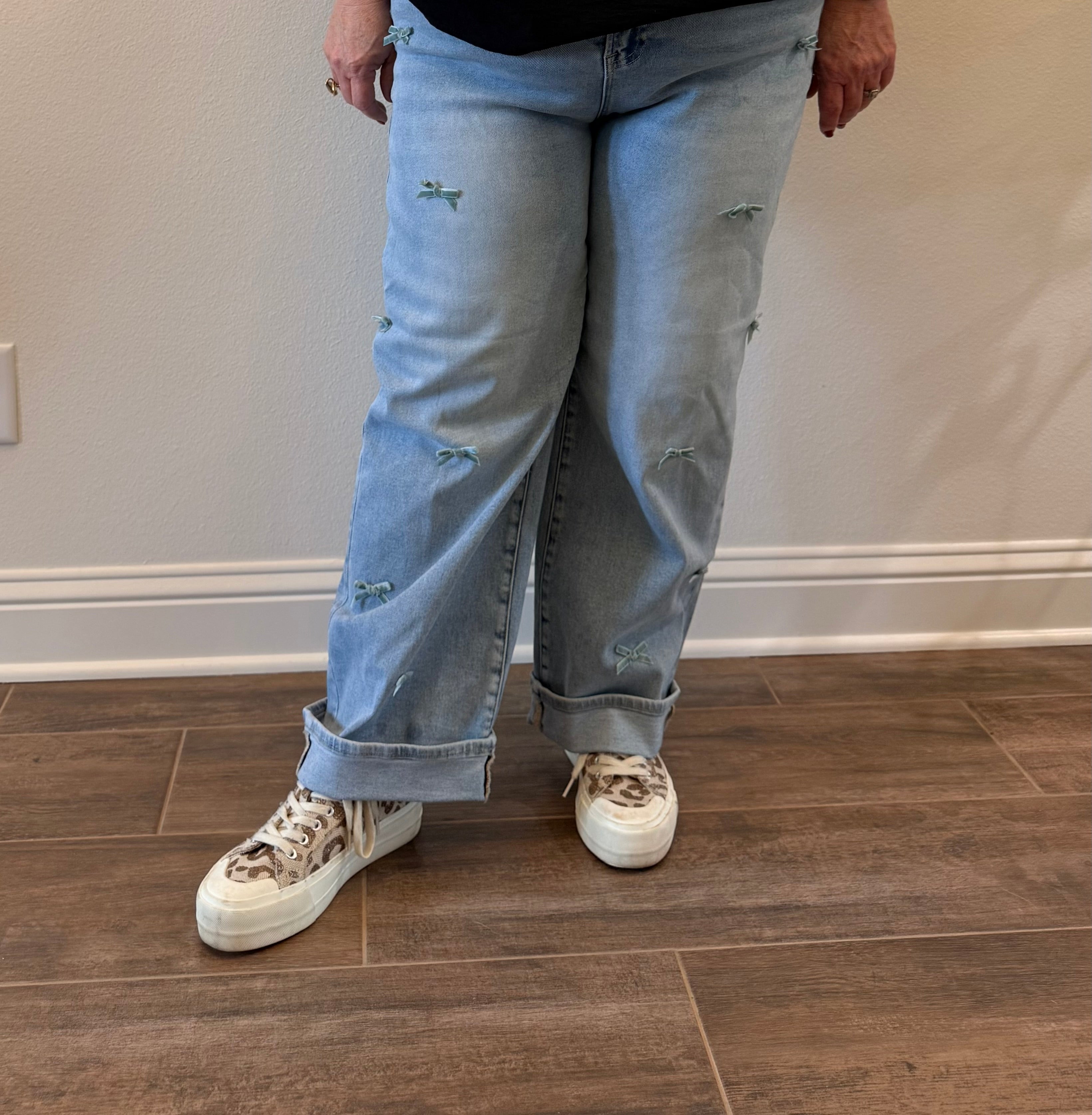 Your denim just got a whole lot cuter. These Risen Bow Jeans feature dainty bow appliqués scattered across the front, giving you that perfect mix of trendy, feminine, and fun. The light wash has a soft, vintage feel, while the relaxed straight-leg fit keeps them comfortable and flattering. Rolled cuffs finish the look with boutique-worthy detail. These jeans are a total statement piece — and guaranteed to get compliments.