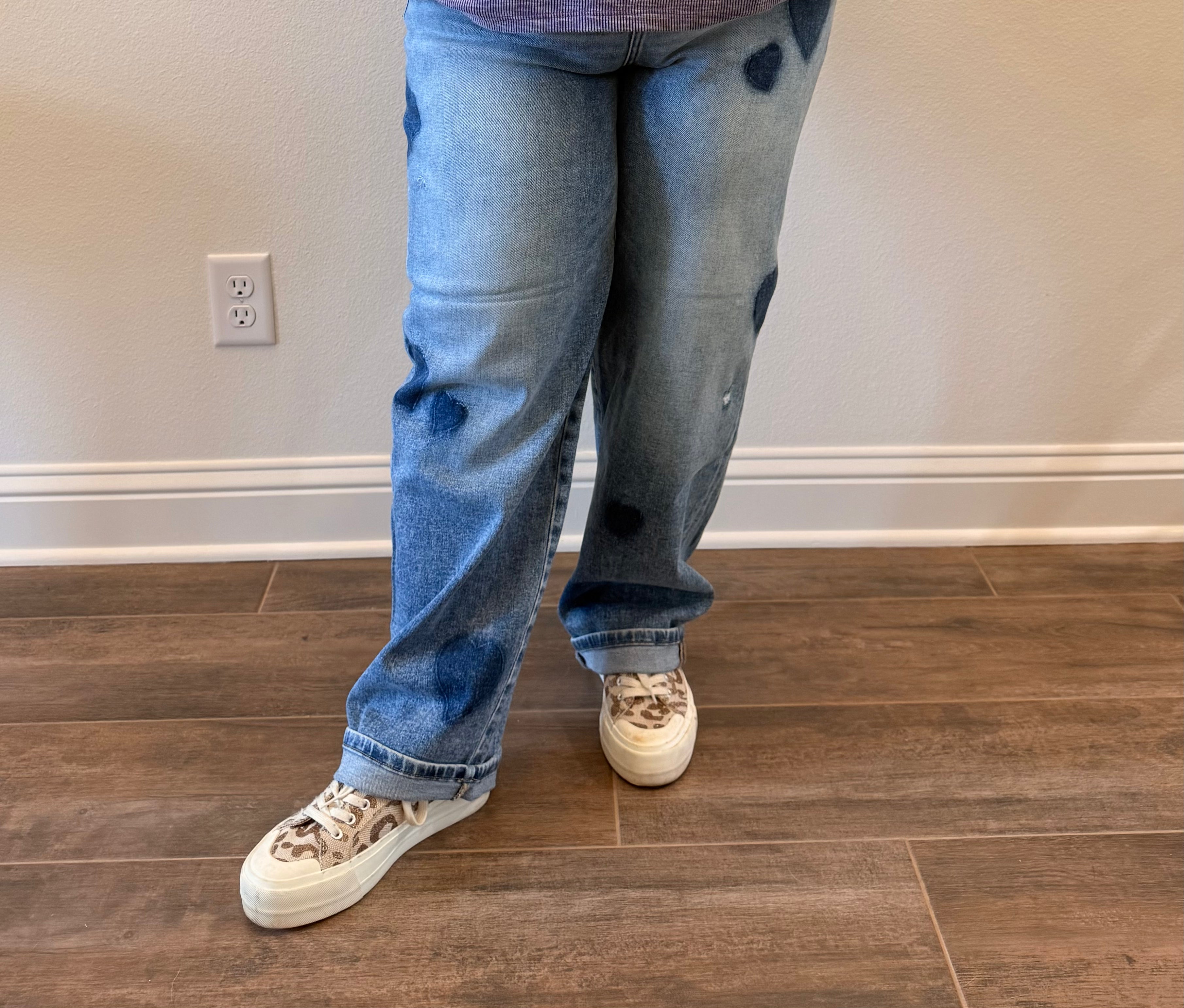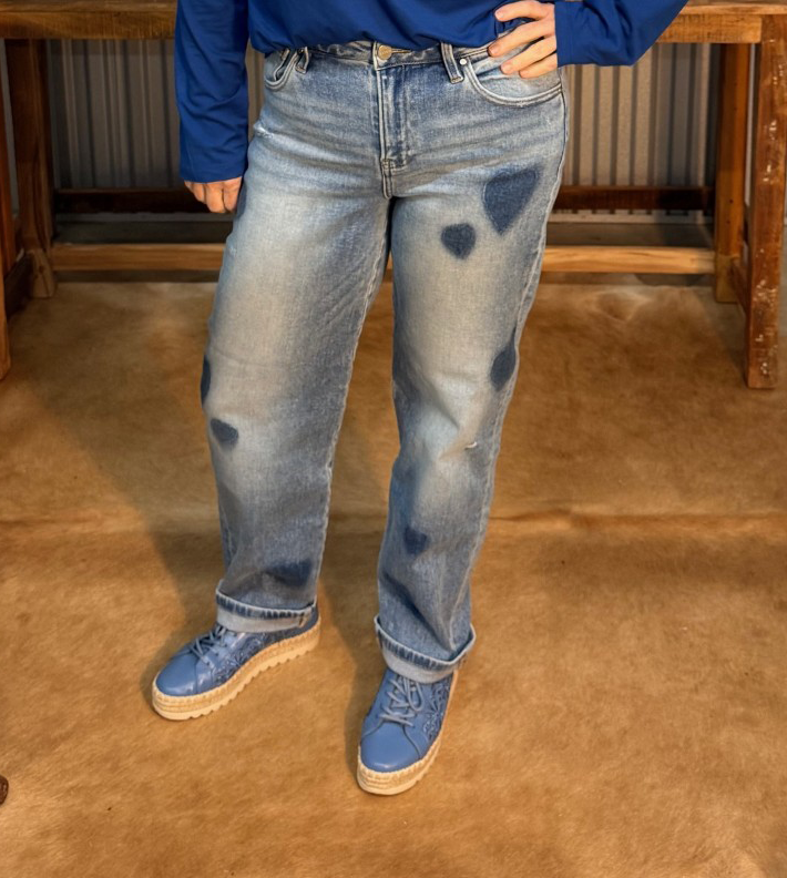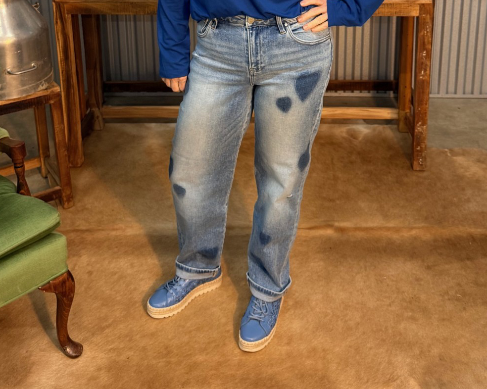 Bring the sweetness with you everywhere you go. These Risen Heart Patch Boyfriend Jeans feature adorable heart-shaped darker denim patches scattered throughout the legs, giving them a fun, playful twist on classic denim. The relaxed boyfriend fit offers comfy, easy wear, while the light wash and gentle distressing add that perfect lived-in vibe. Rolled cuffs complete the boutique-chic look. These jeans are guaranteed to turn heads — and spark compliments.