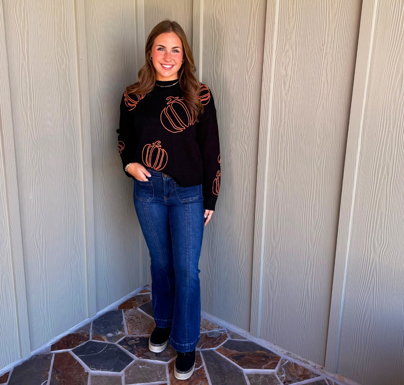 Crafted for those who appreciate thoughtful design, the Pumpkin Patch Sweater combines a classic round neck and long sleeves with a subtle pattern of orange pumpkins. This sweater balances comfort and seasonal detail, making it a sophisticated choice to elevate your autumn wardrobe. Whether you're at the pumpkin patch, a bonfire, or just sipping cider, this cheerful piece brings comfort and charm to your autumn wardrobe.