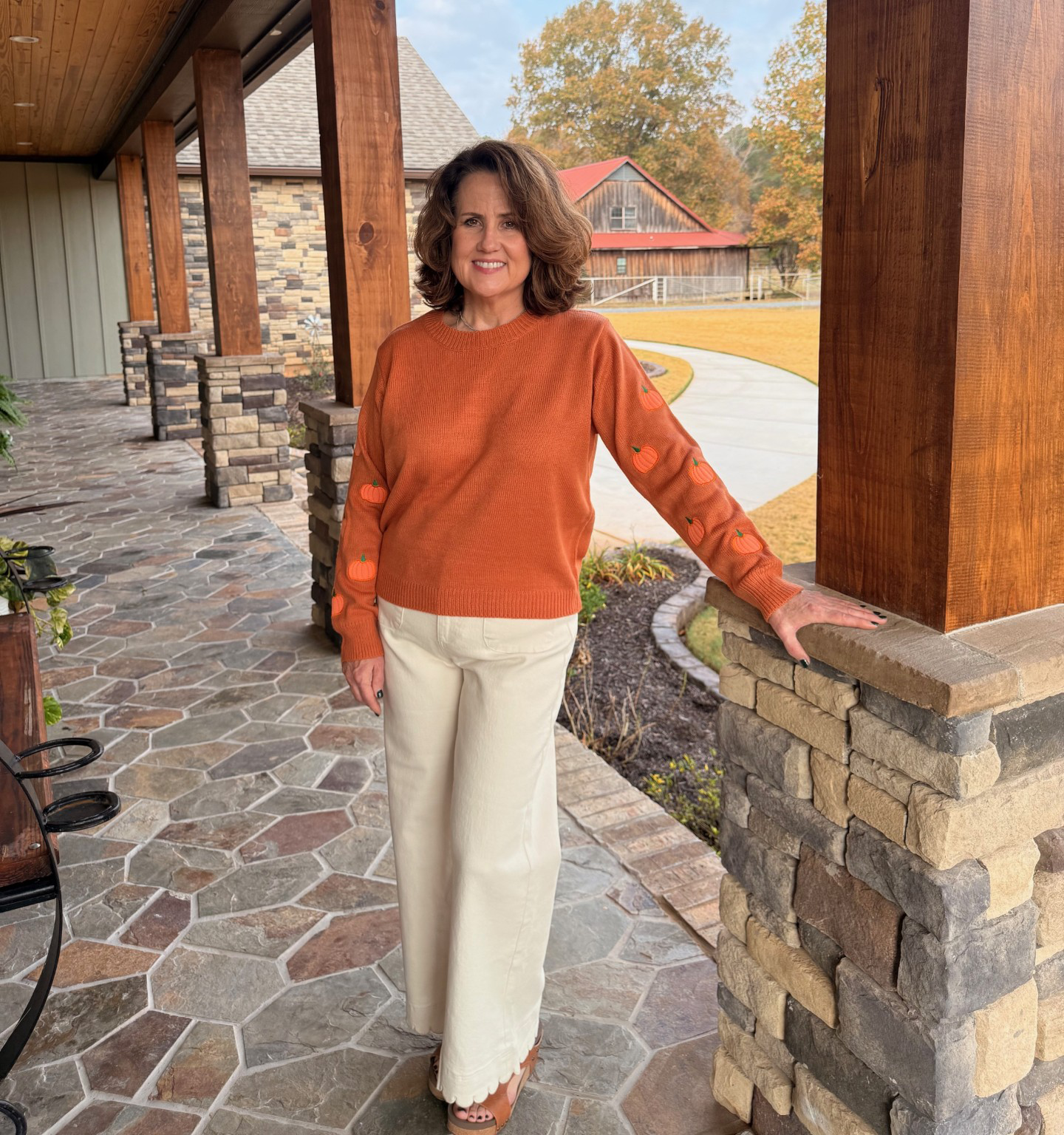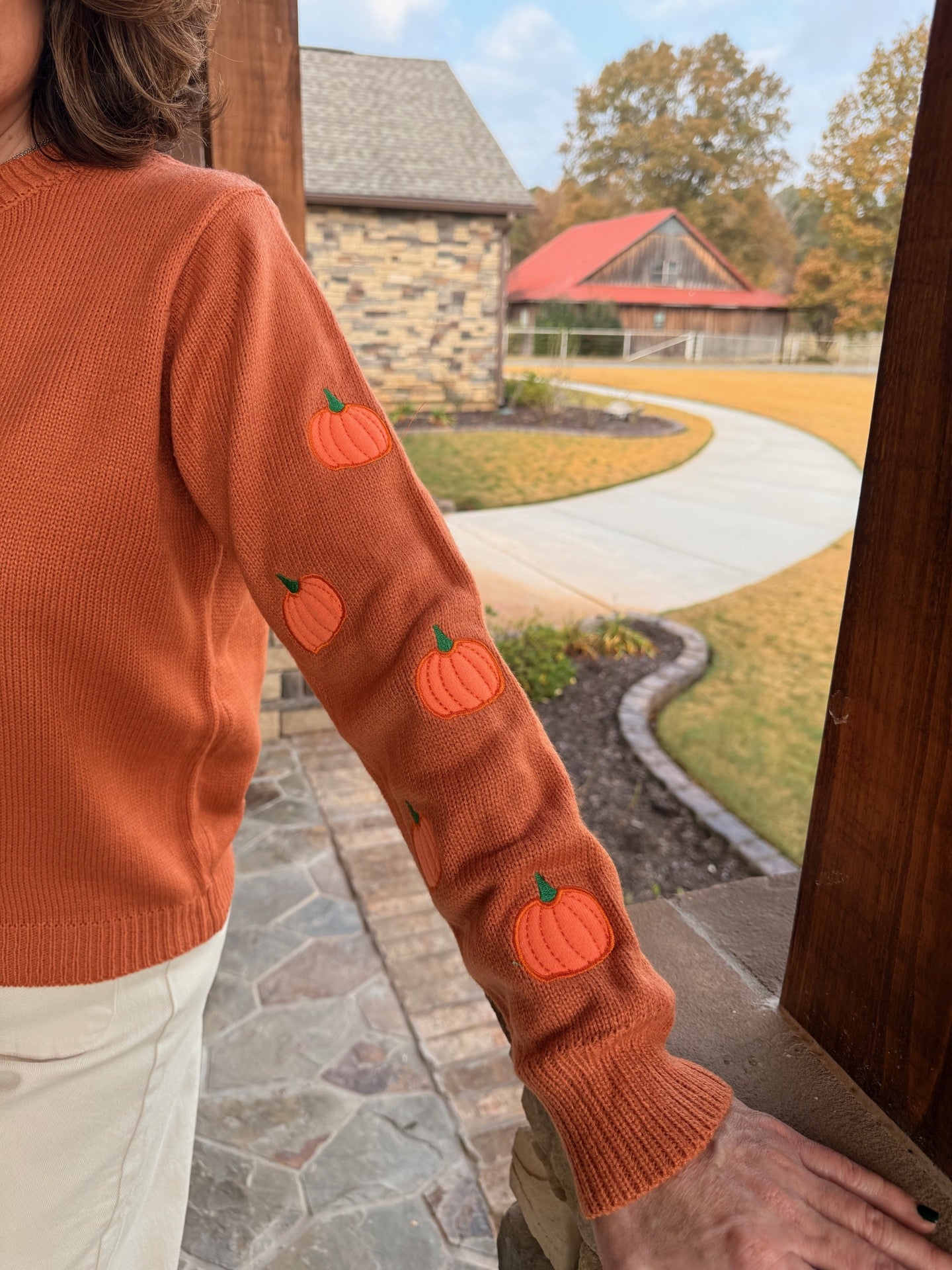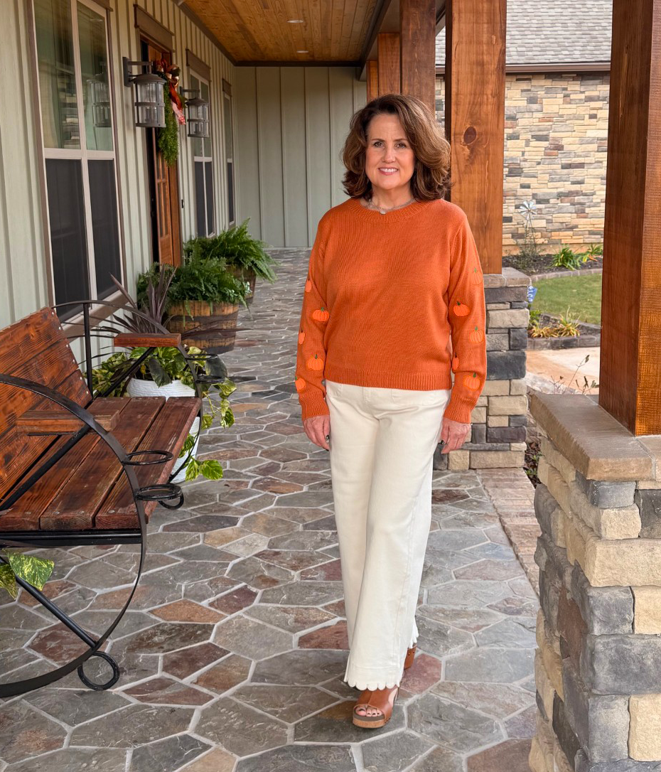 Brighten your wardrobe with the Pumpkin Shine Sweater, featuring a flattering round neck and charming pumpkin appliqués on the sleeves. This vibrant orange sweater adds a festive touch while keeping you comfortable and stylish. Perfect for embracing the season with warmth and eye-catching detail.