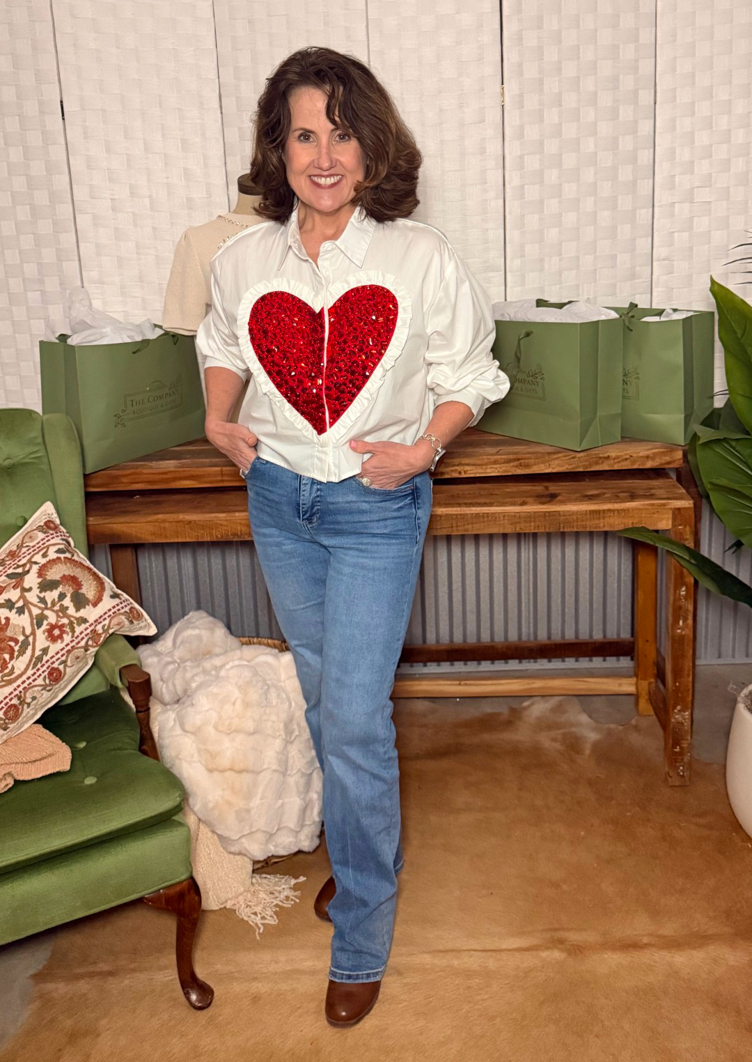Let the heart shine and keep accessories simple. Add denim and boots for a casual sweet-chic vibe, or dress it up with black pants and a bold earring for sparkle-queen status.