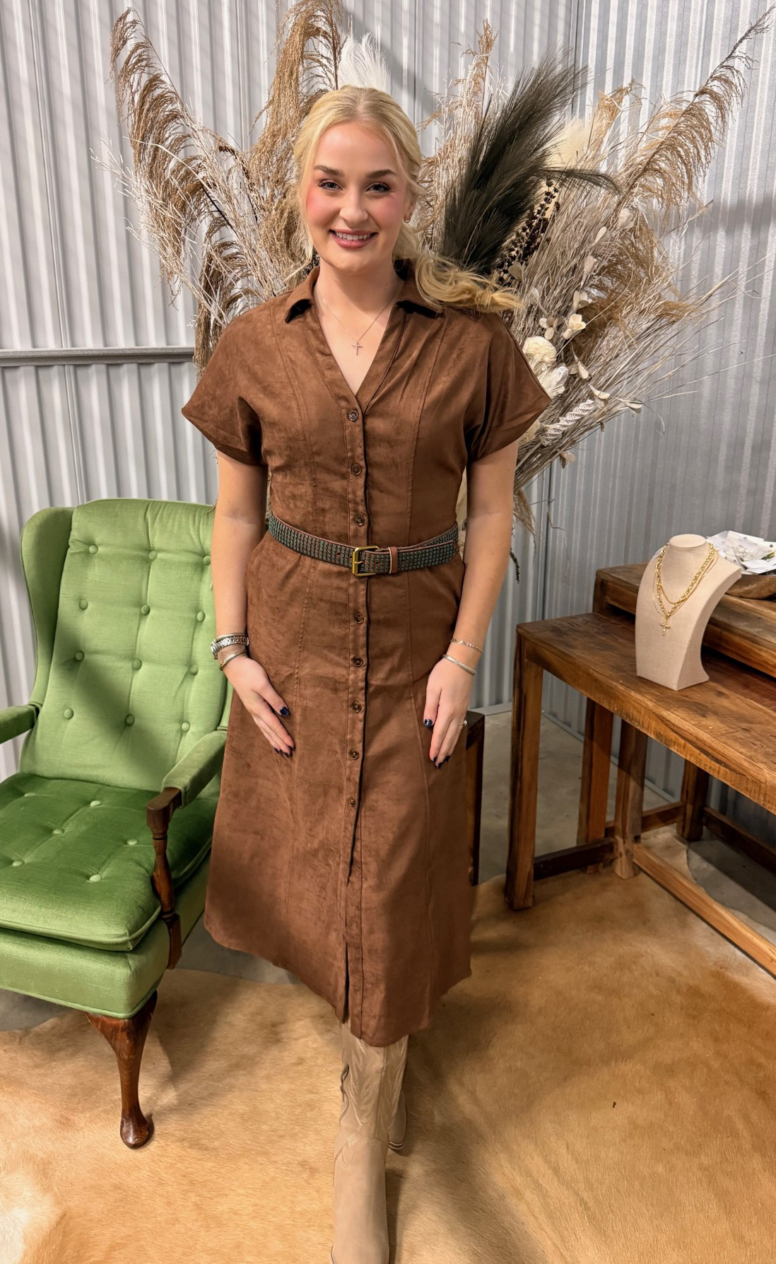 The THML Brown Suede Midi Dress combines classic design with luxurious texture, featuring a fitted waist and button-down front for a tailored silhouette. Its structured collar complements the full skirt, creating a timeless and elegant look perfect for both professional and social occasions. Crafted from rich brown suede, this dress offers an upscale feel while maintaining versatile comfort.