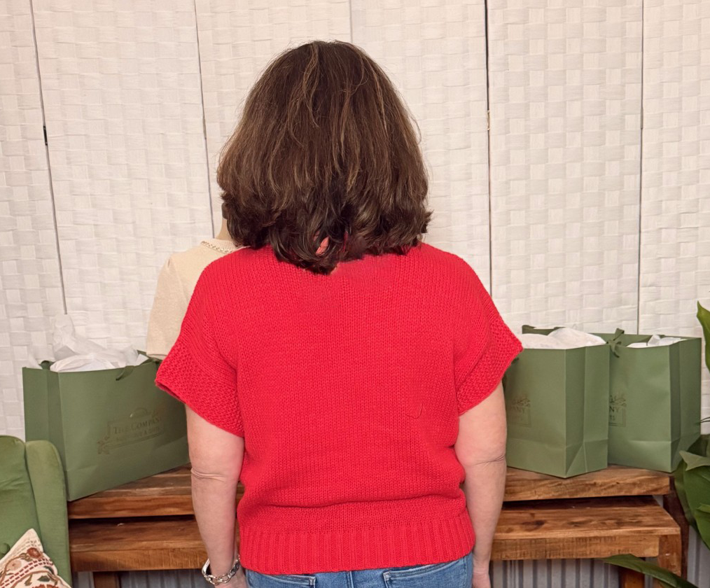 Cute, cozy, and full of love! This red knit sweater by BiBi features an oversized white heart on the front that makes the perfect statement for Valentine’s Day — or any day you want to spread a little sweetness. The mock neck and relaxed short sleeves give it a trendy, effortless vibe that pairs beautifully with denim, skirts, or leggings.