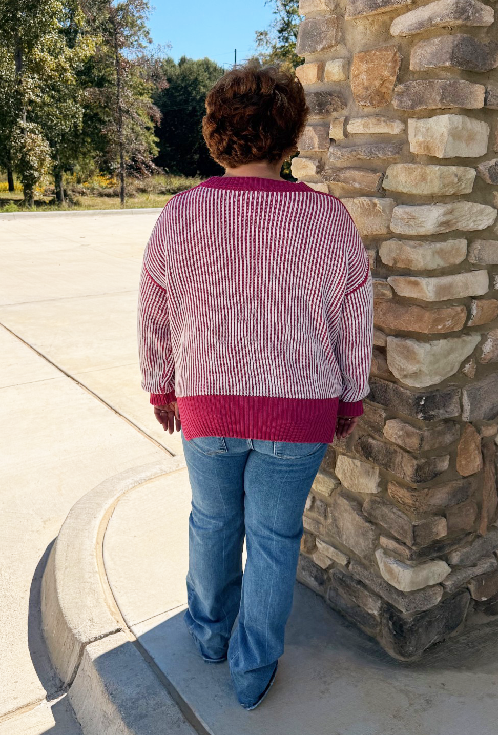 Brighten your day with the BiBi Two Tone Rib Knit Relaxed Fit Sweater, featuring cheerful red and white vertical stripes and bold red trim at the neck, cuffs, and hem. Its relaxed fit offers cozy comfort, while the vibrant color combo adds a playful pop to your outfit. Pair it with leggings or jeans for an easy, feel-good look that’s perfect for any casual occasion.