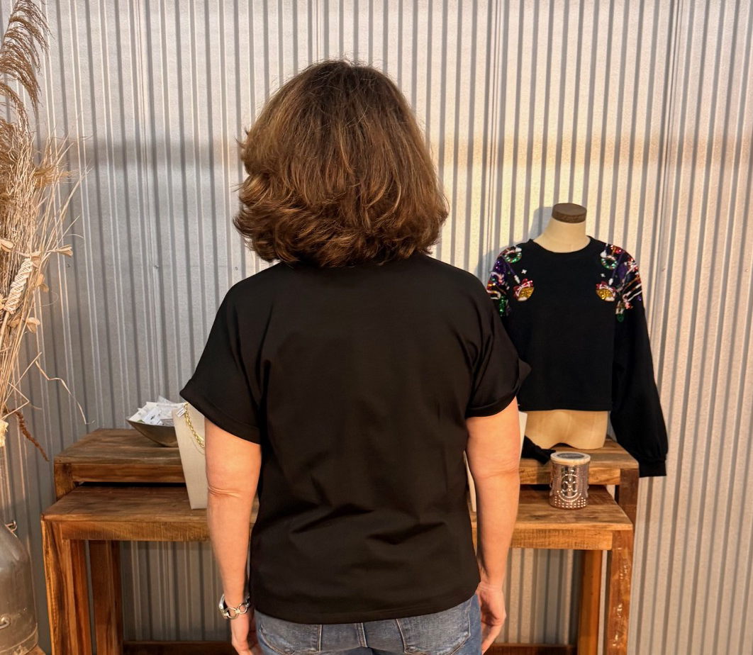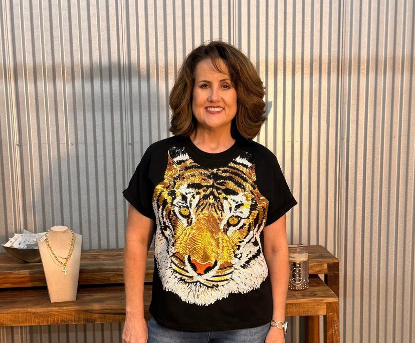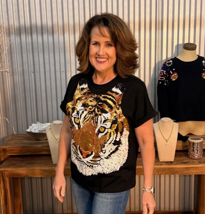 ring the roar everywhere you go with this stunning Sequin Tiger Tee! Covered in rich gold, white, and black sequins, this bold tiger face takes center stage against a sleek black backdrop. The sparkle and detail are chef’s kiss — turning an everyday tee into a statement piece perfect for gameday, tailgates, or simply showing off your wild side.