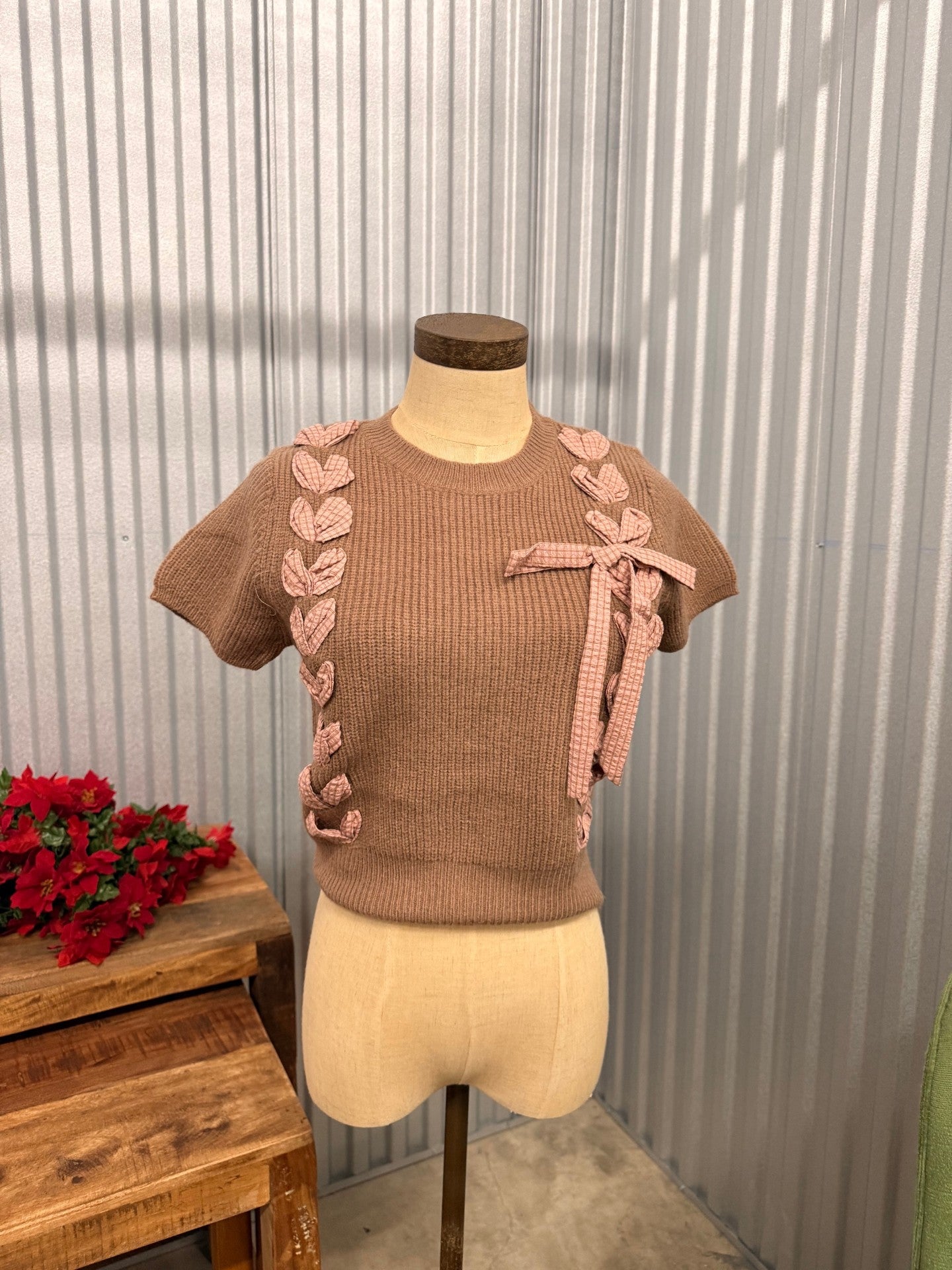 Sweet, feminine, and full of charming detail—this cocoa knit top is a total standout. The ribbed sweater texture gives it a structured yet cozy feel, while the contrast woven ribbon bows along the sides and shoulder bring a playful, boutique-worthy touch. Short sleeves and a fitted hem give it a flattering, polished silhouette you can dress up or down with ease.