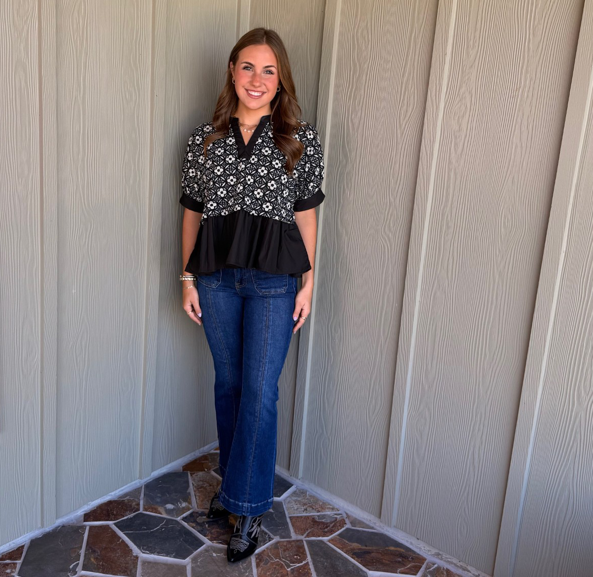 Elevate your style with the Entro Black Crochet Ruffle Top, designed to combine comfort and elegance. Featuring a flattering V-neck and short sleeves, this top highlights a delicate crochet detail and a flowy hem for a feminine, airy feel. Perfect for both casual outings and dressier occasions, it adds a touch of sophistication to any outfit effortlessly.