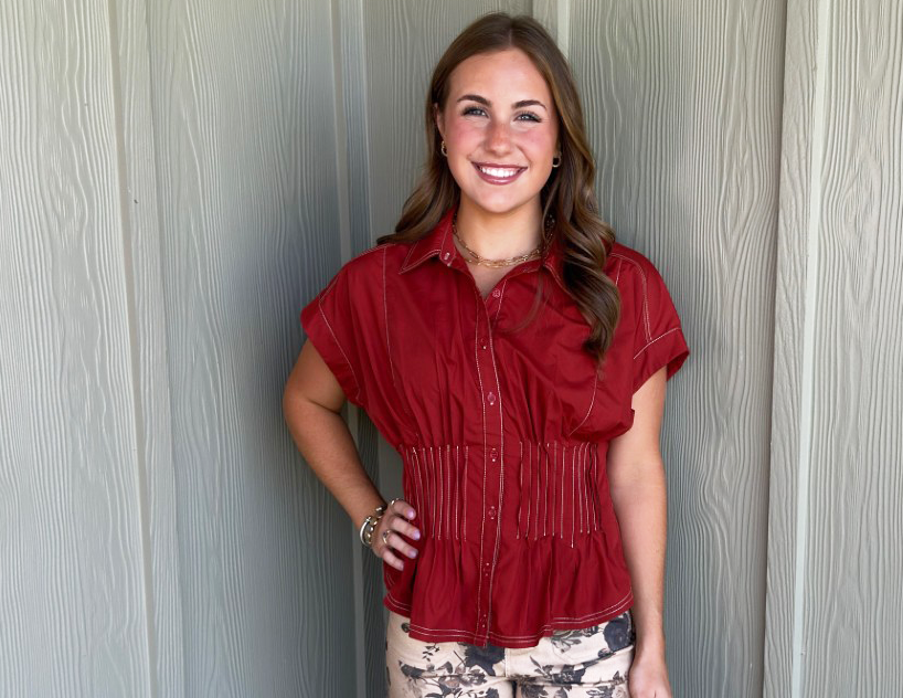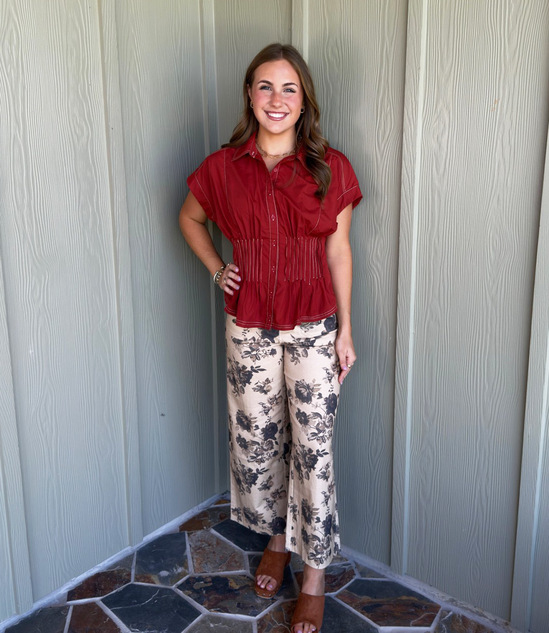 This rust blouse is effortlessly chic with a modern Western flair. It features short sleeves, a structured collared neckline, and flattering rouching along the waist that accentuates your figure beautifully. The lightweight fabric drapes softly, making it perfect for pairing with high-waisted trousers, denim, or statement floral pants for a polished yet relaxed look.