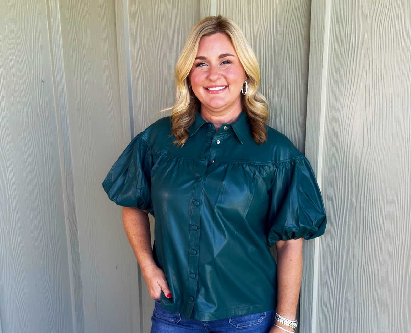 Make a memorable statement with the Entro Teal Green Faux Leather Top. This classy button-down features a sharp collar and elegantly puffed sleeves, combining timeless sophistication with modern edge. Crafted from smooth faux leather, it’s designed to turn heads and elevate your style for any occasion where you want to stand out. Don’t miss your moment to shine with this standout piece.