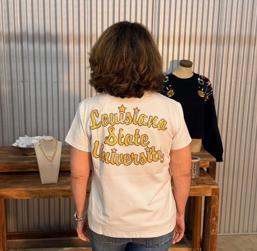 Rep your Tigers in the cutest vintage-inspired way! This white tee features a sparkly old-school LSU Tiger head on the front and a bold “Louisiana State University” sequin script with stars on the back. The perfect blend of classic school spirit and modern sparkle, this tee is comfy, lightweight, and game-day ready. A total must-have for fans who love a little extra shine!