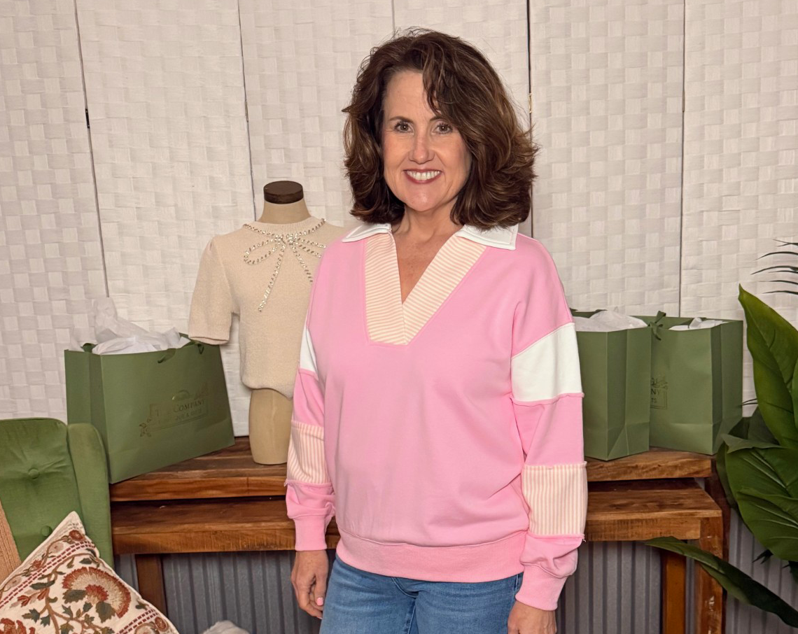 Meet your new go-to for casual days with a polished twist. This colorblock collared pullover blends soft pink hues with textured paneling for a look that feels both cozy and elevated. The structured collar and relaxed fit make it easy to dress up or down, whether you’re running errands or meeting friends for coffee.