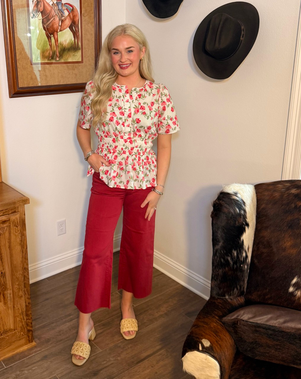 Fresh, flirty, and full of charm, this floral blouse is made for spring days and sweet moments. Featuring a soft cream background with vibrant pink florals, it’s finished with a smocked waist that creates a flattering, feminine silhouette. The airy fabric and flutter sleeves keep it light and comfortable while still feeling dressed up.