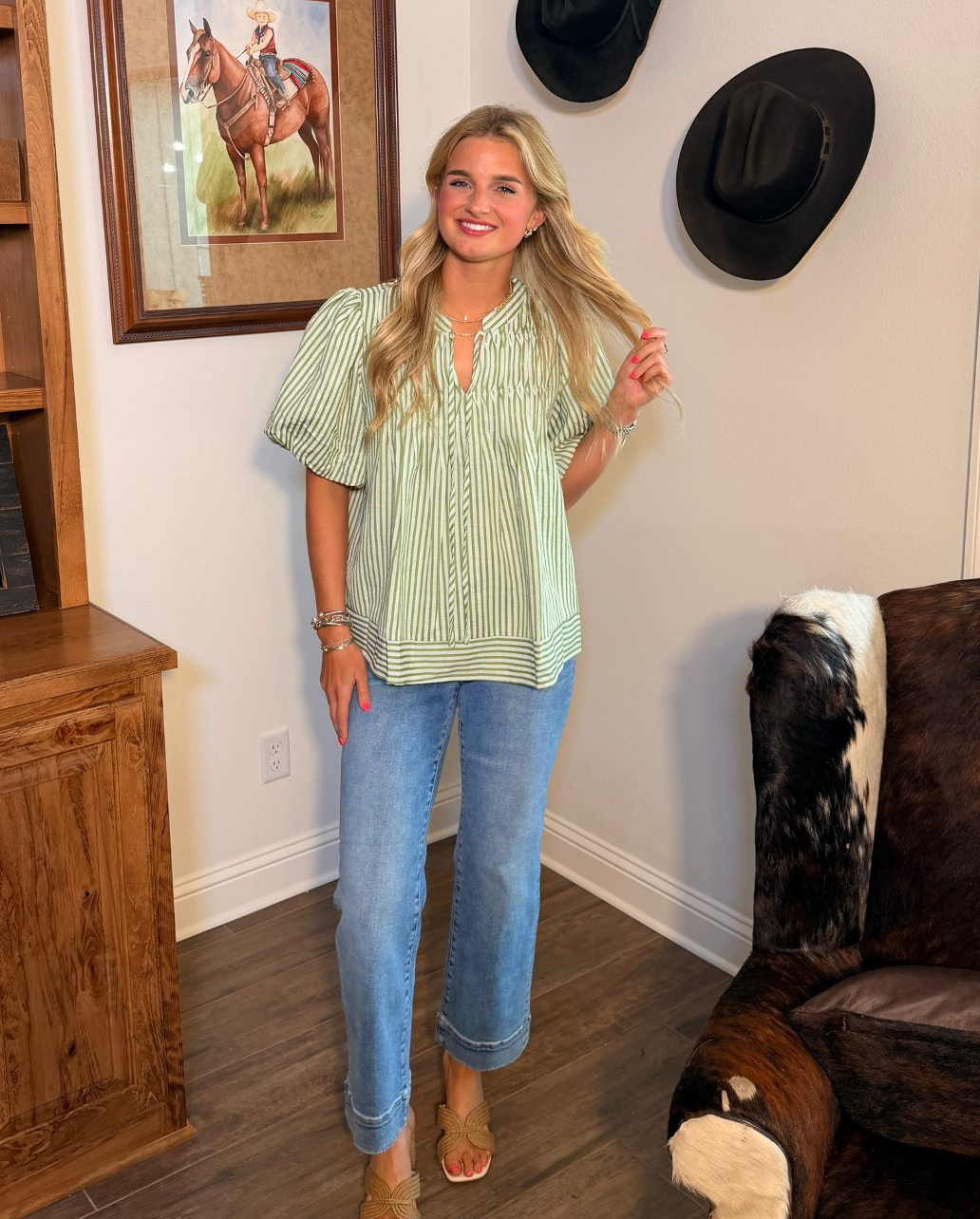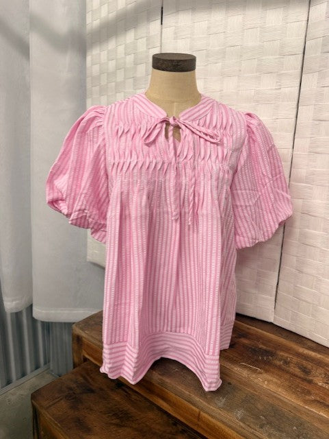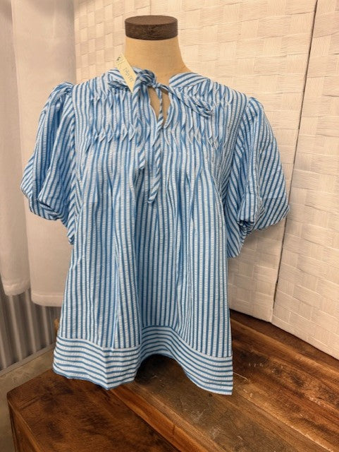 Charming and easy to wear, this striped top features a delicate bow tie neckline and soft puff sleeves for a feminine, elevated look. The relaxed silhouette keeps it comfortable while the stripe pattern adds a classic touch. It’s one of those pieces that feels dressed up without feeling fussy.