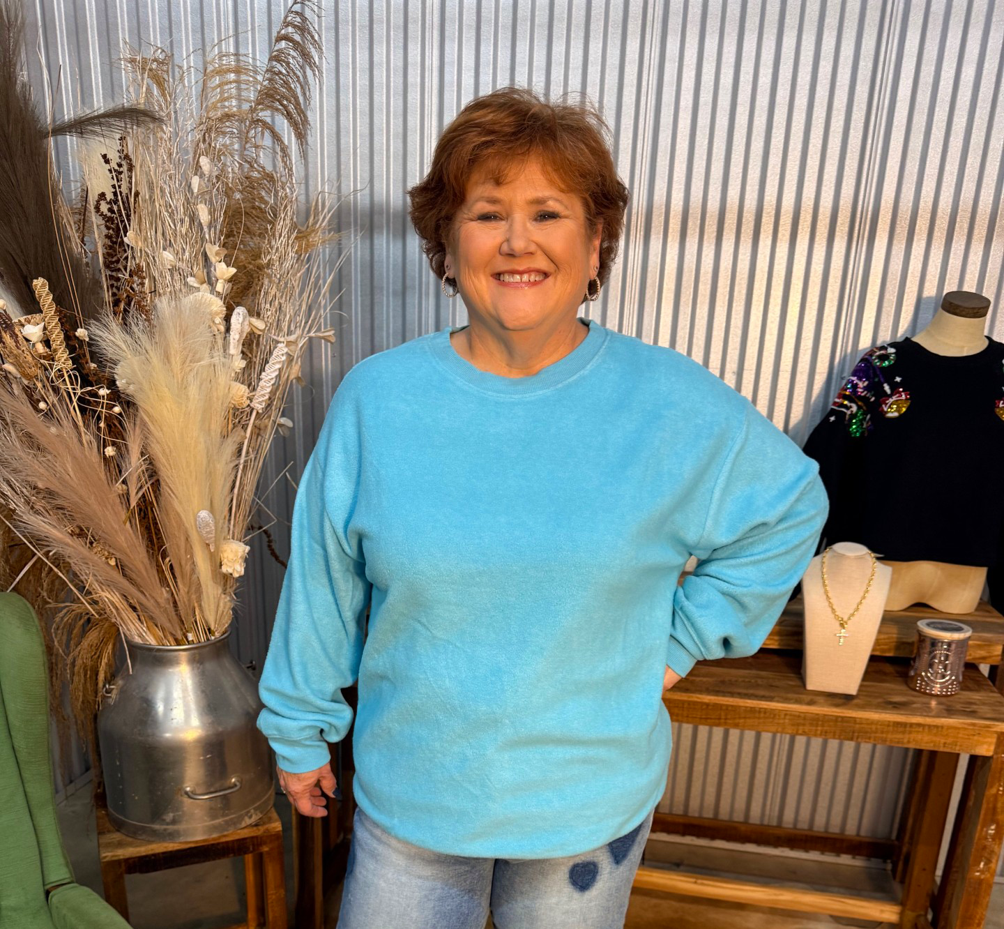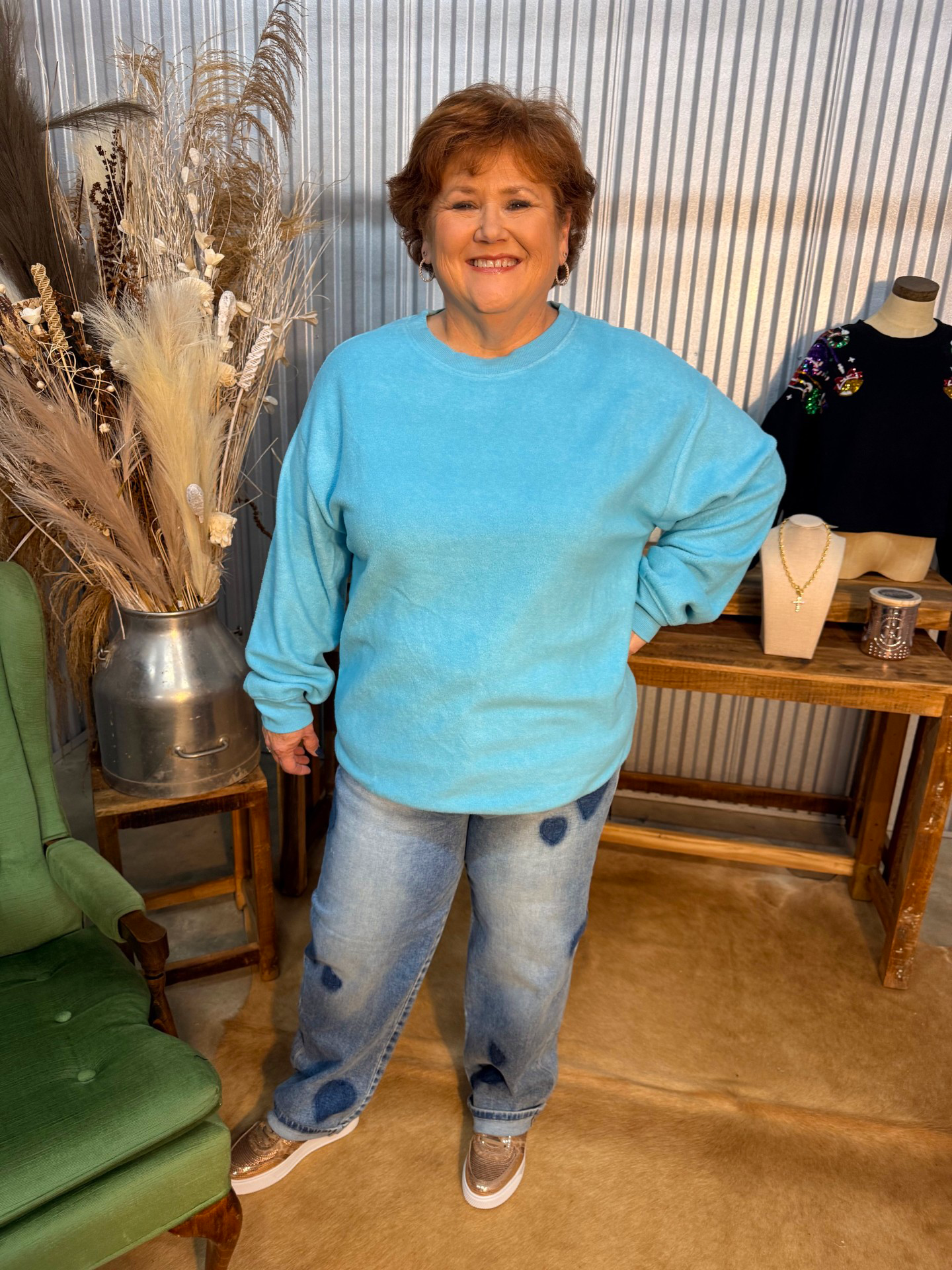 Slip into softness with this ultra-cozy fleece sweatshirt in the dreamiest aqua blue shade. Designed for comfort-first days, it features a relaxed, slightly oversized fit that drapes beautifully without feeling bulky. The plush fabric feels like a warm hug, making it your new go-to for lounging, errands, or layering on cooler days.